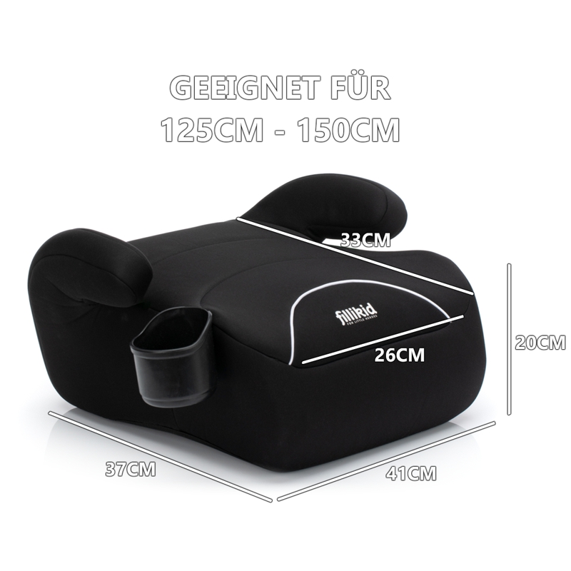Diese sehr hochwertige Sitzerhöhung mit verstellbarer Gurtführung des Premiumhersteller Fillikid ist nach der Norm ECE R129 zertifiziert, welche der neuesten EU-Norm für Kindersitze entspricht. Die Sitzerhöhung hat eine komfortable, anatomische, extra große Sitzfläche und gepolsterte Armlehnen, wodurch sie auch bei langen Fahrten einen angenehmen Sitzplatz bietet. Zudem kann das atmungsaktive Polster einfach abgenommen und gewaschen werden. Der im Lieferumfang enthaltene Flaschenhalter ist ein praktisches Accessoire und kann beidseitig angebracht oder auch abgenommen werden. Geeignet ist die Sitzerhöhung für Kinder von 125 cm bis 150 cm. Dieser Autositz kann in Fahrzeugen mit 3-Punkt Sicherheitsgurten befestigt werden und bietet Ihrem Kind dank der verstellbaren Gurtführung ein hohes Maß an Komfort und die nötige Sicherheit.
