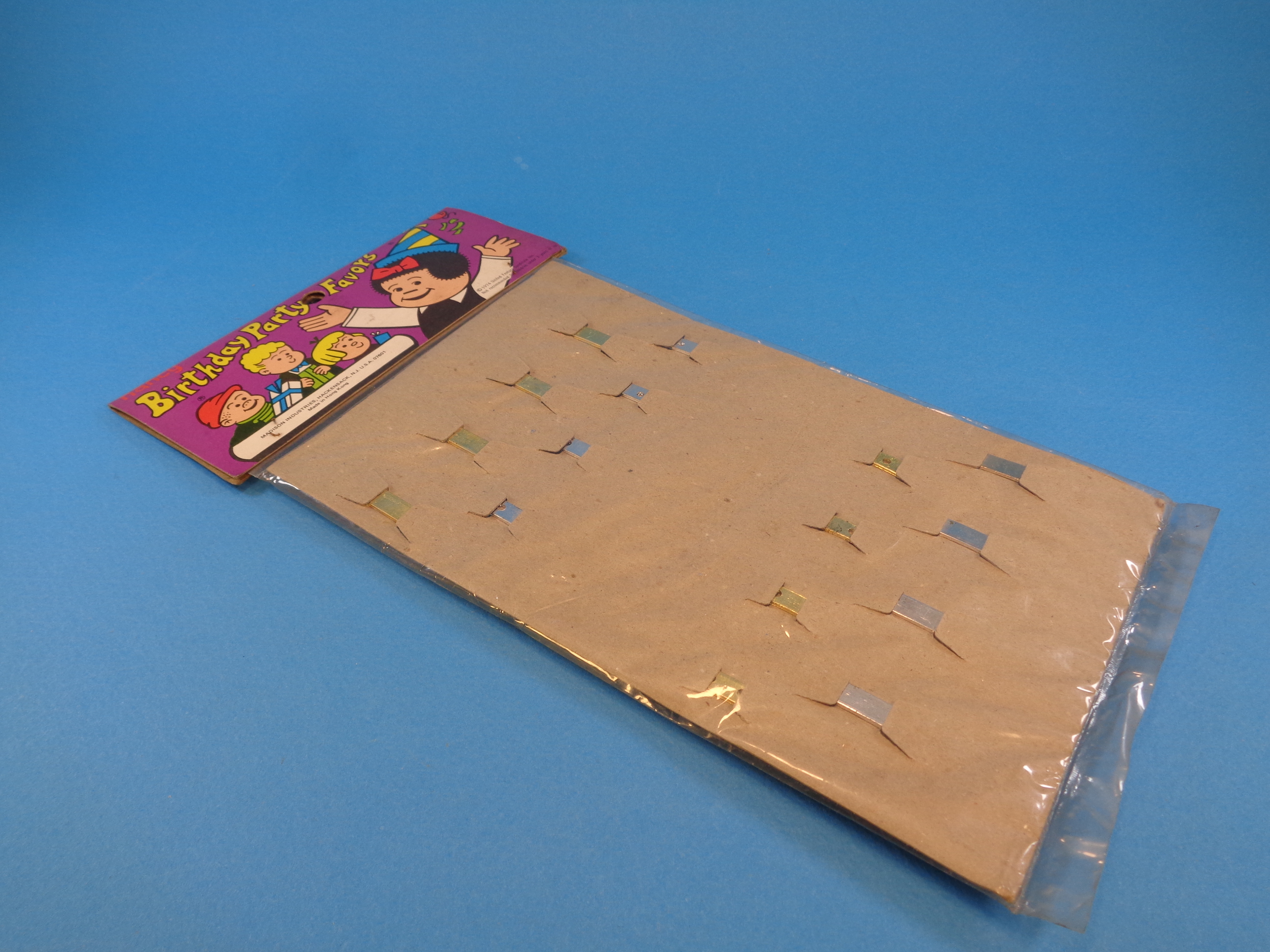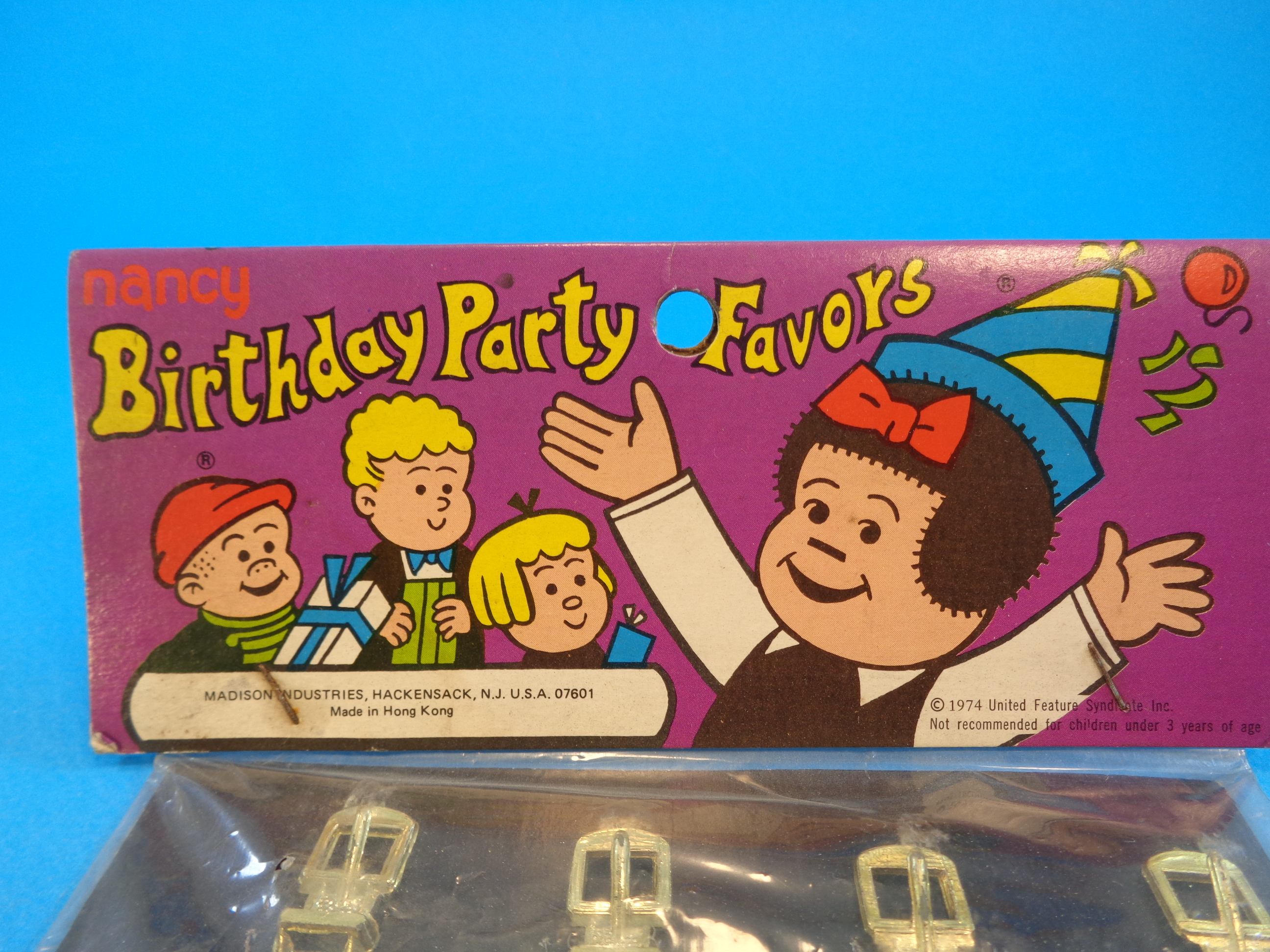 This set is new old stock (NOS) and remains sealed in its original packaging, with colorful header card with Nancy and her friends colorful artwork. The card reads: "Nancy / Birthday Party Favors".