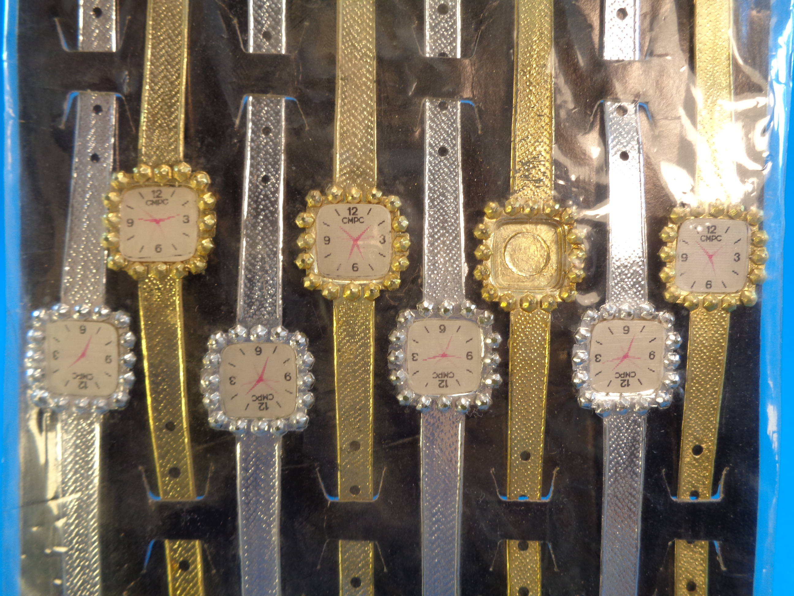 Item never used or played. One golden watch has loose its paper quadrant inside the bag. The packaging shows minor wear due to age, but remains sealed and intact.
