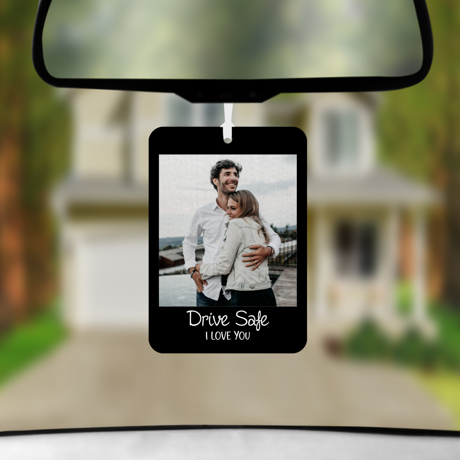 Car air freshener. Customised with your own photo and text on and you can add your own custom scent. The air fresheners are made from Subli-Fabric Board (SFB) so have the matte finish.