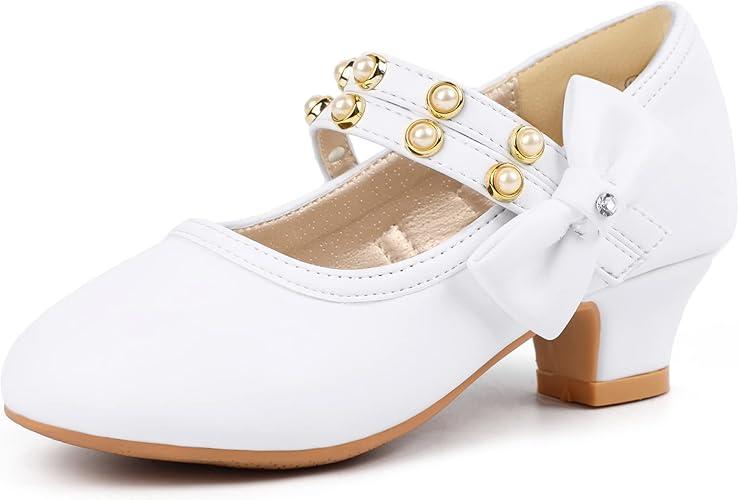 SUPER CUTE GIRLS HEELS: We elaborately selected durable and comfortable materials for these girls low heel mary jane shoes. The cute flower and pearls element on the strap makes the shoes so special and unique. Shiny and fancy dress heels for your princess!