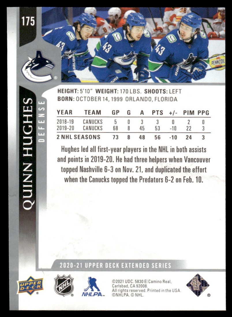 | Description: | Quinn Hughes | | Category: | Hockey | | Year: | 2020 | | Product: | Upper Deck | | Team: | Vancouver Canucks | | Card Number: | 175 | | Special: | TRIPLE EXPOSURE | | Dimensions: | 3½" x 2½" | | SKU: | HK a0113 R65 D (44) |