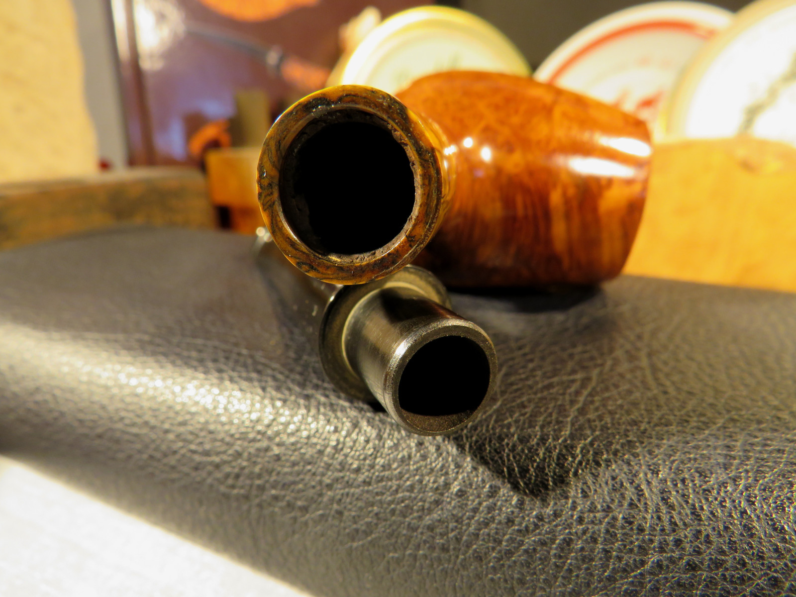 Wie auf den Fotos zu sehen ist, wurde auch das Mundstück komplett aufgearbeitet und maschinenpoliert. Keine Bißspuren. Mundstücke werden von mir grundsätzlich erst mit Ultraschall, dann mit Alkohol mehrfach gereinigt und keimfrei gemacht. Danach in drei Durchgängen (vor-,fein- und Hochglanz) poliert. Die Pfeife ist rauchfertig.