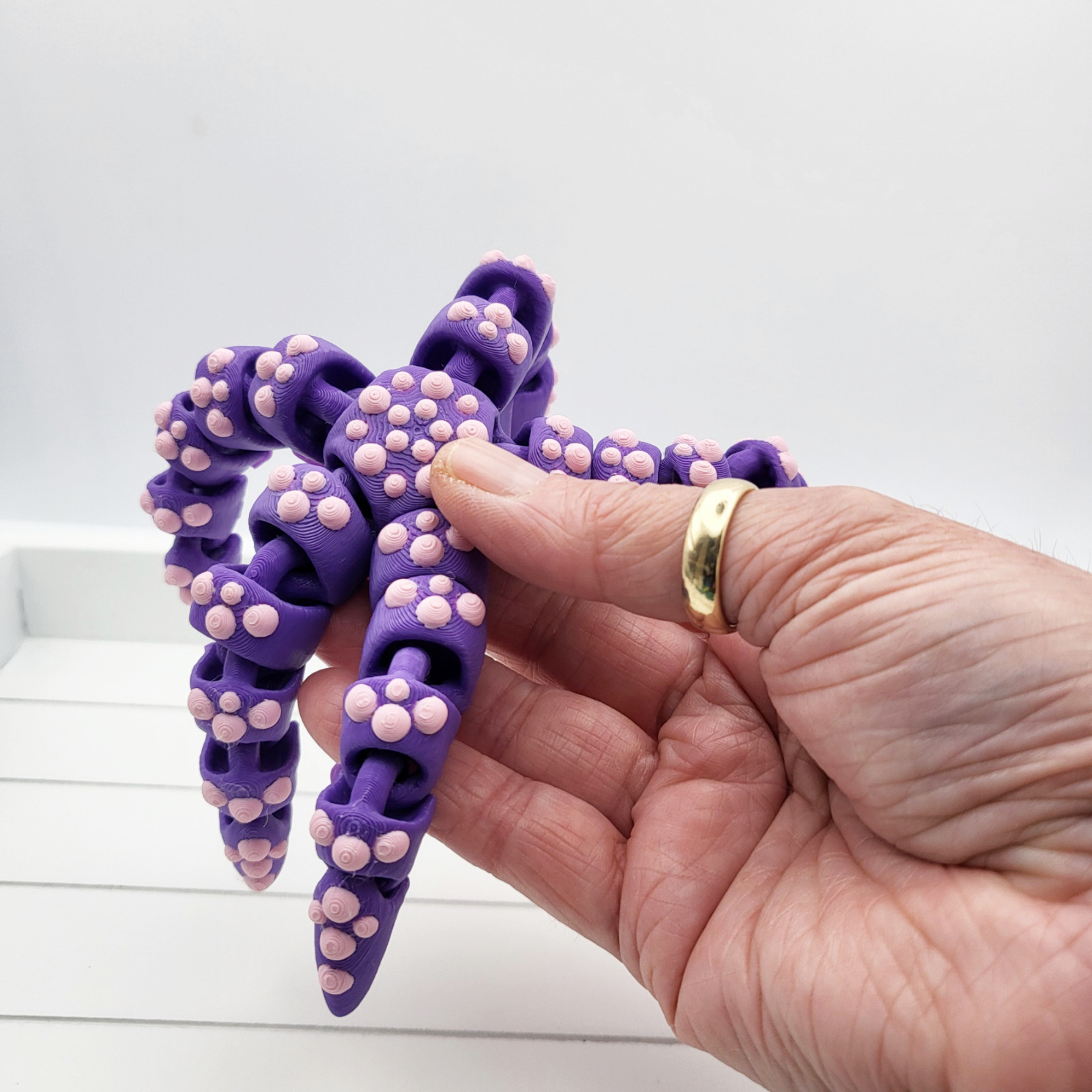 This 3D printed Starfish. The unique Starfish shape and articulated design make it a great fidget toy as well. Available in a range of colours to suit your personal style, simply pick your desired colour in the dropdown box.Made from durable PLA material, environmentally friendly biodegradable.The intricate design showcases the United Kingdom's quality craftsmanship. Perfect for collectors or as a gift for animal lovers, this charming Starfish is a perfect addition.Size Length 154 mm x Width 161 mm x 20mm Height approx== INFORMATION ==Due to the nature of 3D printing, there may be small imperfections or layer lines. These are all normal parts of the 3D printing process and cannot be avoided.Please keep in mind that you will receive a unique item. Our Rainbow filaments transition through many colours. Dual & Tri Colour filaments consists of multiple colours. We do not have control over the exact colour positions on the model so your model may be slightly different from our photos.== CLEANING ==To clean the plastic, do not expose to high heat. The bio-sourced plastic is affected by temperatures above 65 degrees Celsius (150 Fahrenheit).Gently wash with soap and slightly warm water.=== DISCLAIMER ===These are NOT intended for small children or for unattended use as they do have many small parts that can become unattached and become a choking hazard or hazard in general. We take no responsibility for the misuse of this item.Design Copyright: Cinderwing (The Crafty Print Company is an authorised reseller).