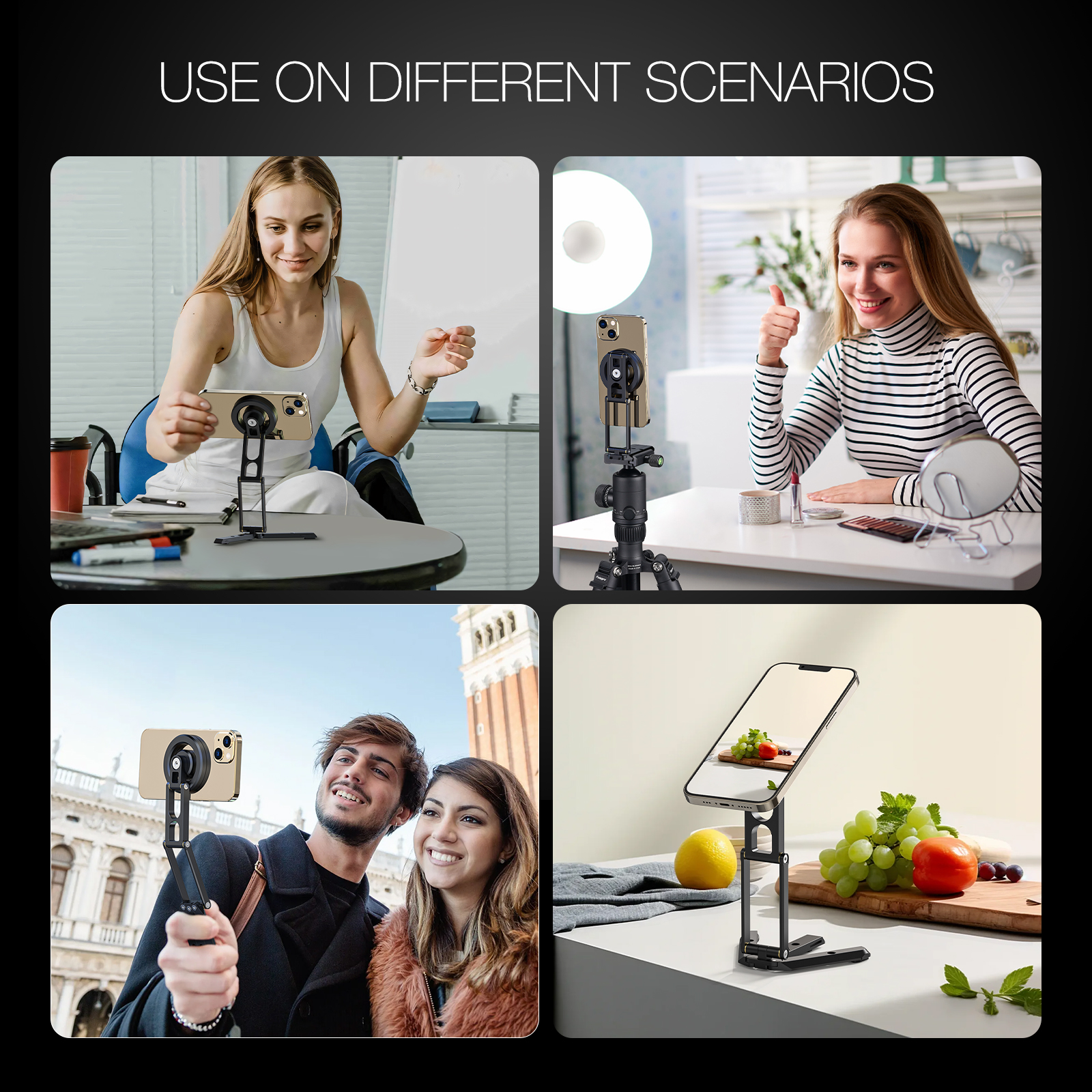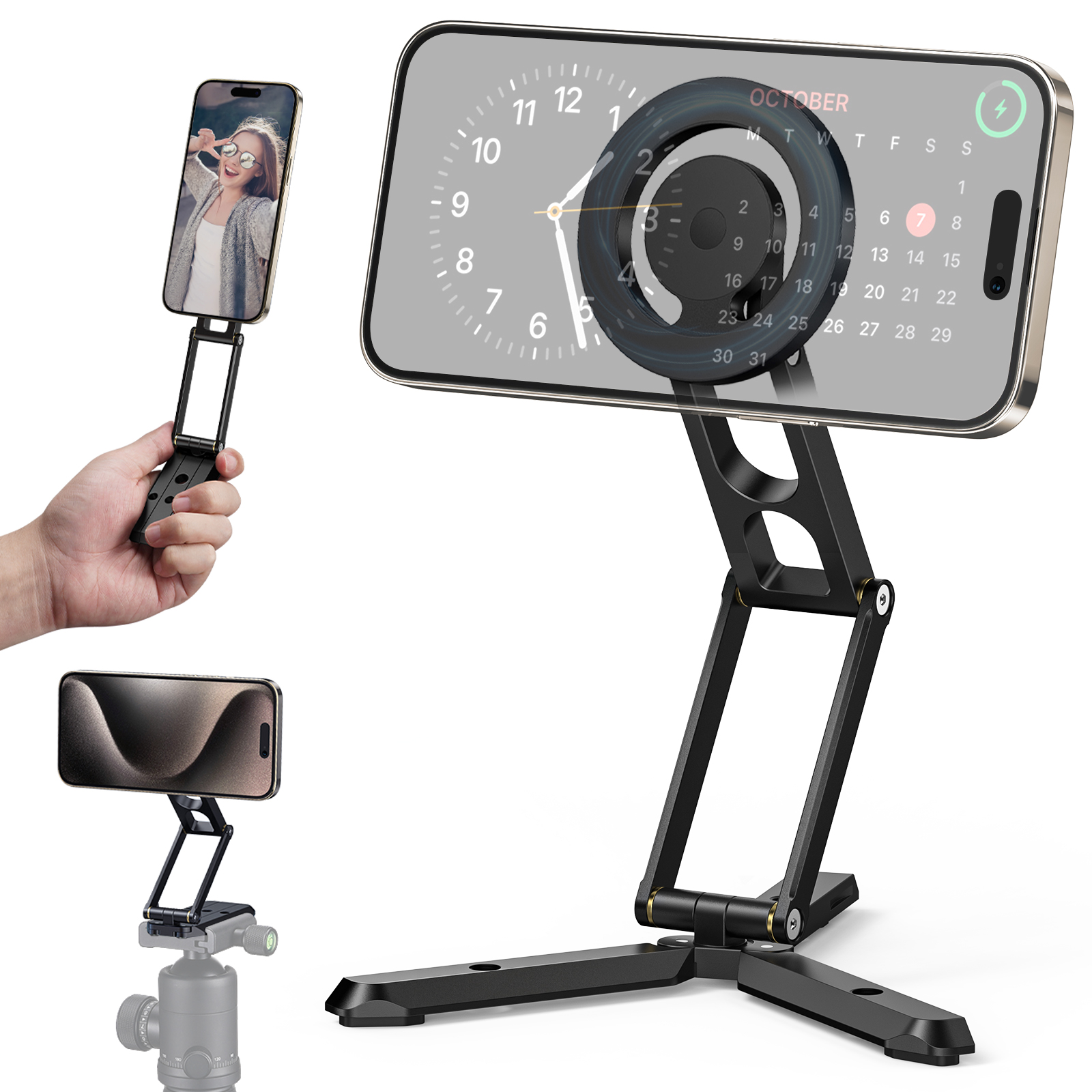 Perfect Compatibility Magnetic Tripod The Magnetic Compatible with iPhone 15/15 Plus/15 Pro/15 Pro Max/14/14 Plus/14 Pro/14 Pro Max/13/13 Pro/13 mini/13 Pro Max/12/12 Pro/12 mini/12 Pro Max, official magnetic protective cases, etc The magnetic metal ring included in the package can be attached to iPhone 11 and below, Android phones, and cases for a MagSafe effect that keeps your phone completely steady and stable