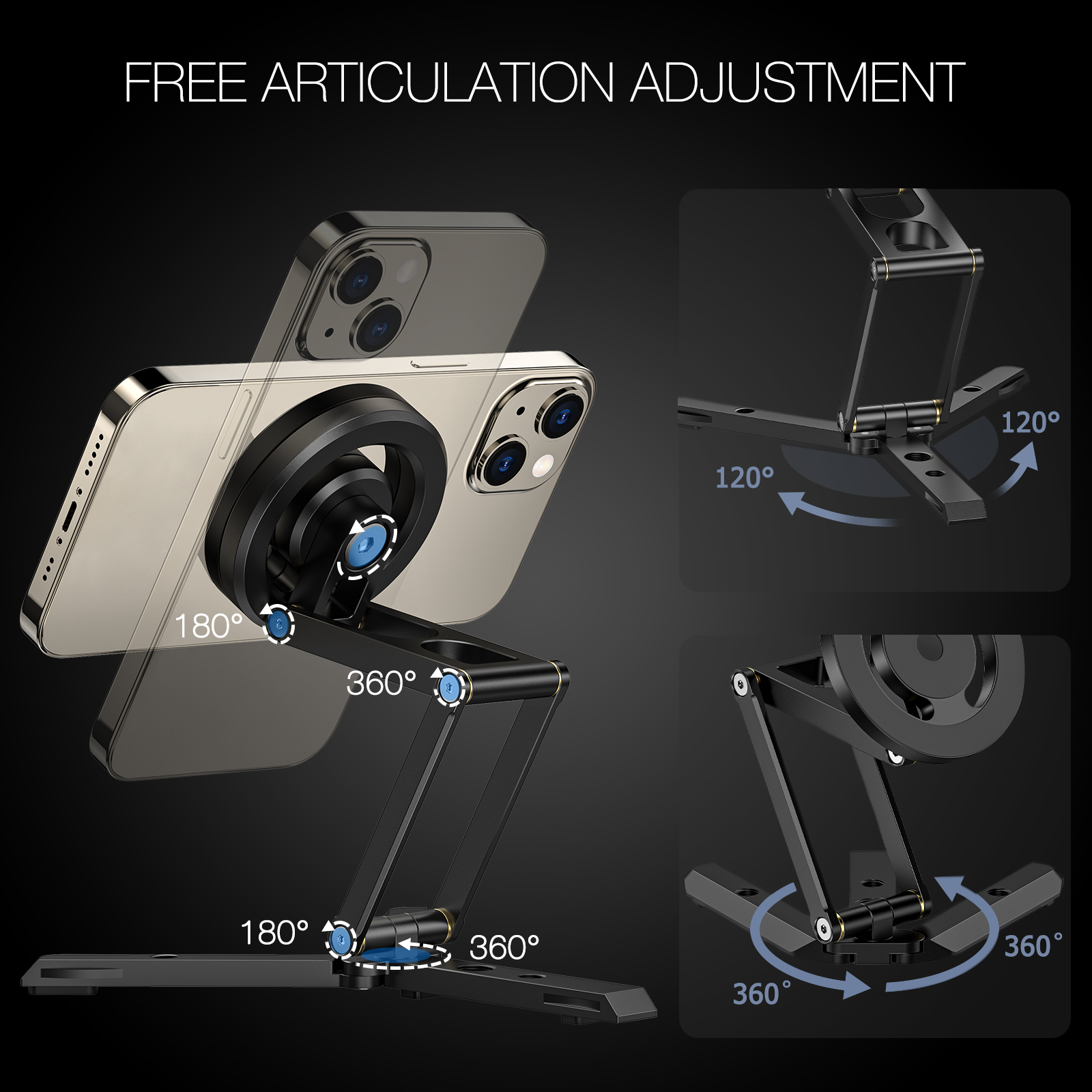 Tri-Fold Free Angles Adjustable The tri fold design includes an additional spread height and a larger grip for convenience Its length effortlessly adjusts from 3.15 inches (80mm) to a substantial 10.24 inches (260mm), while reaching a maximum expanded elevation of 7.1 inches (180mm), and each folding angle supports 310°, 360°, 180° of adjustment With a 360 degree rotating pivot at the bottom, this mini phone tripod allows for easy phone camera locating in overhead, upward, vertical, and other shooting positions