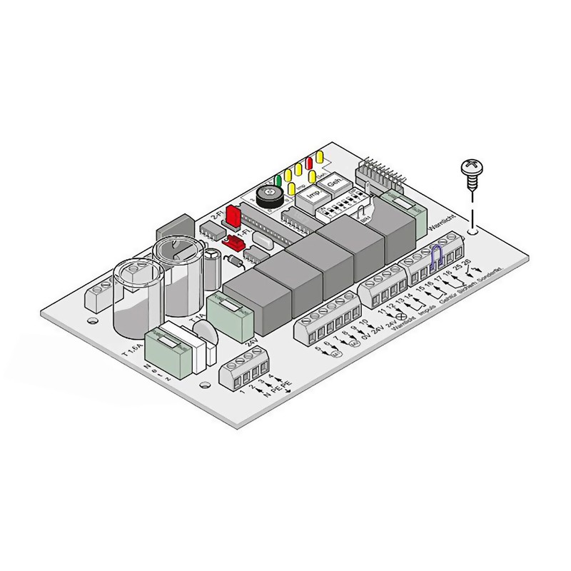 Die Platine fungiert in erster Linie als Vermittler zwischen den Antriebseinheiten und Eingabegeräten wie Wandtaster oder Handsender. So stellt sie sicher, dass die vom Antrieb ausgeführten Befehle ausgeführt werden. Die SOMMER-Steuerungsplatine Twist 200 E/EL enthält so alle Anschlüsse für die Befehlsgeber, wie zum Beispiel den Taster oder den dem Handsender zugeordneten Funkempfänger.