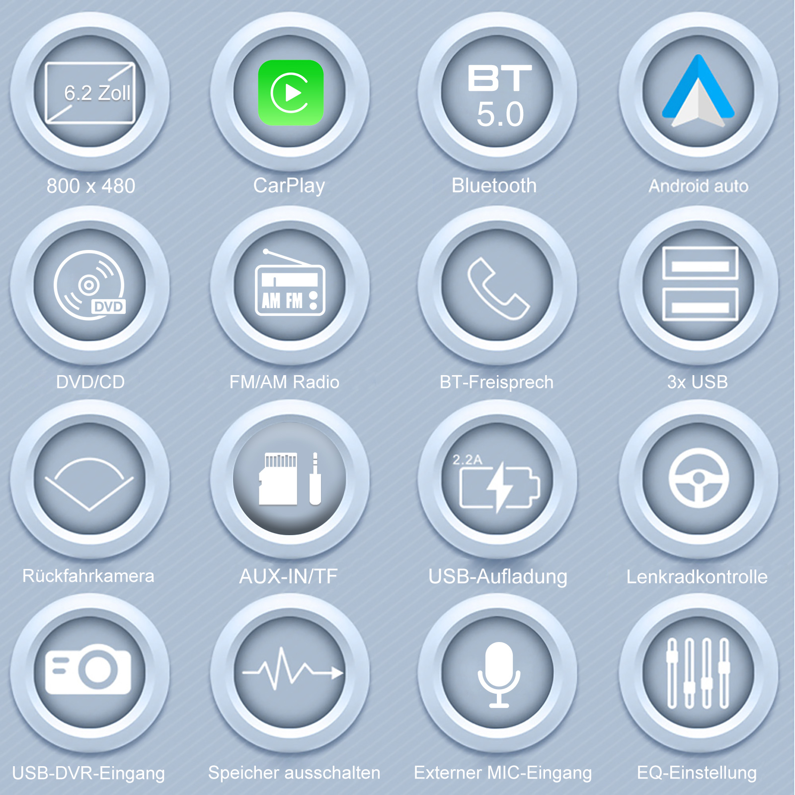 Phone Mirror Link: Das Autoradio mit CD/DVD-Player unterstützt die Mirror Link-Funktion, synchronisiert Ihr Telefon über ein USB-Kabel mit dem Bordbildschirm und zeigt Karten, Filme, YouTube usw. an. Es verfügt über einen 6,2-Zoll-HD-Touchscreen mit einer Auflösung von 800*480 und unterstützt die Wiedergabe von 1080P-Videos. Bestimmte Apps, die nicht von CarPlay unterstützt werden, können dennoch über diese Funktion angezeigt werden. (Bitte beachten Sie: 1. Dies ist die MirrorLink-Funktion, nicht die Carplay-Funktion. 2. MirrorLink dient dazu, den auf dem Mobiltelefonbildschirm angezeigten Inhalt auf den Doppel-DIN-Autoradio-Bildschirm zu spiegeln und unterstützt keine App-Bedienung auf dem Bildschirm).