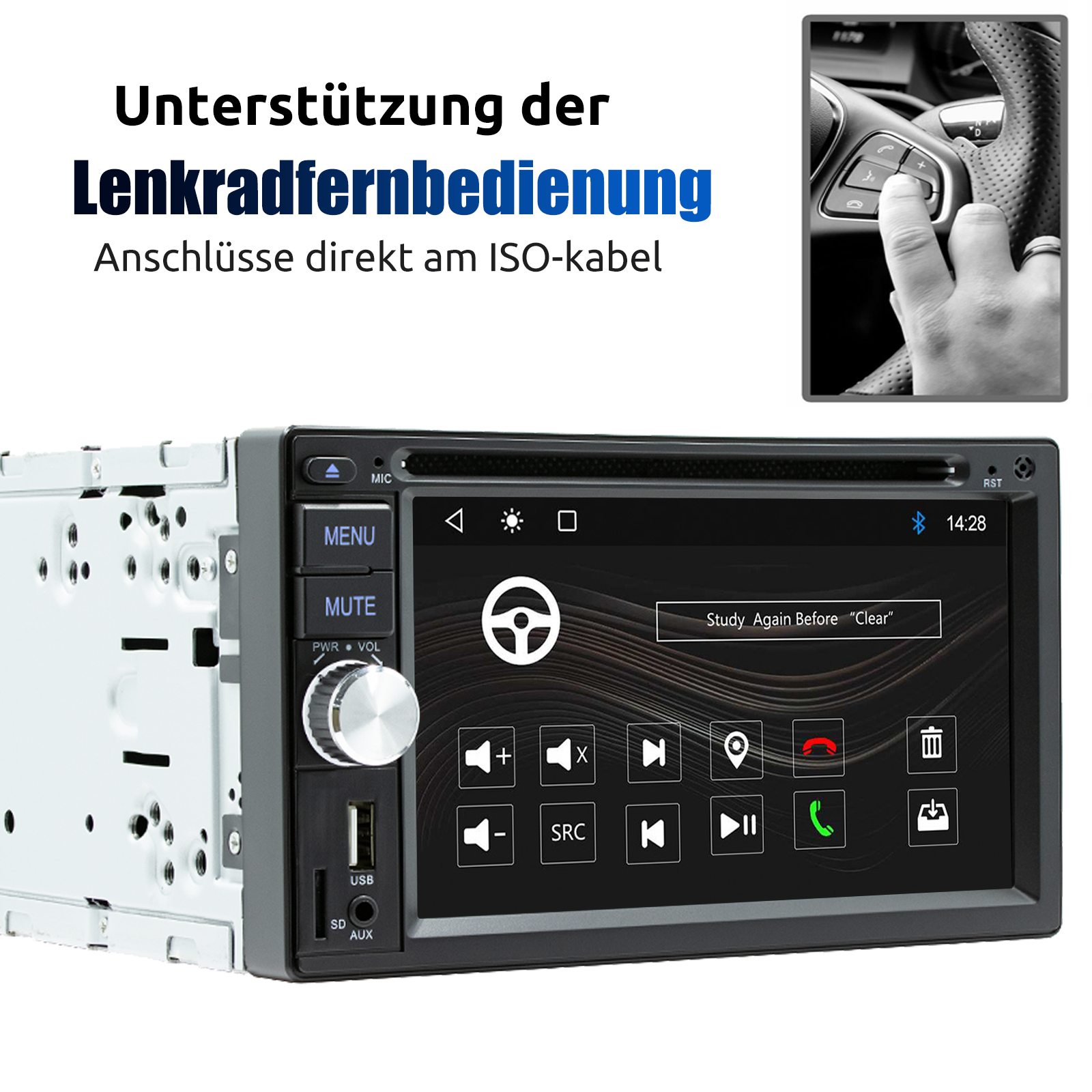 Lenkradsteuerung: Befolgen Sie einfach die Bedienungsanleitung und verbinden Sie das SWC-Kabel Ihres Fahrzeugs mit dem entsprechenden Anschluss dieses Geräts. Dadurch können Sie das Bluetooth-Autoradio mithilfe der Lenkradsteuerungstasten des Fahrzeugs bedienen, was Ihre Fahrt bequemer macht.