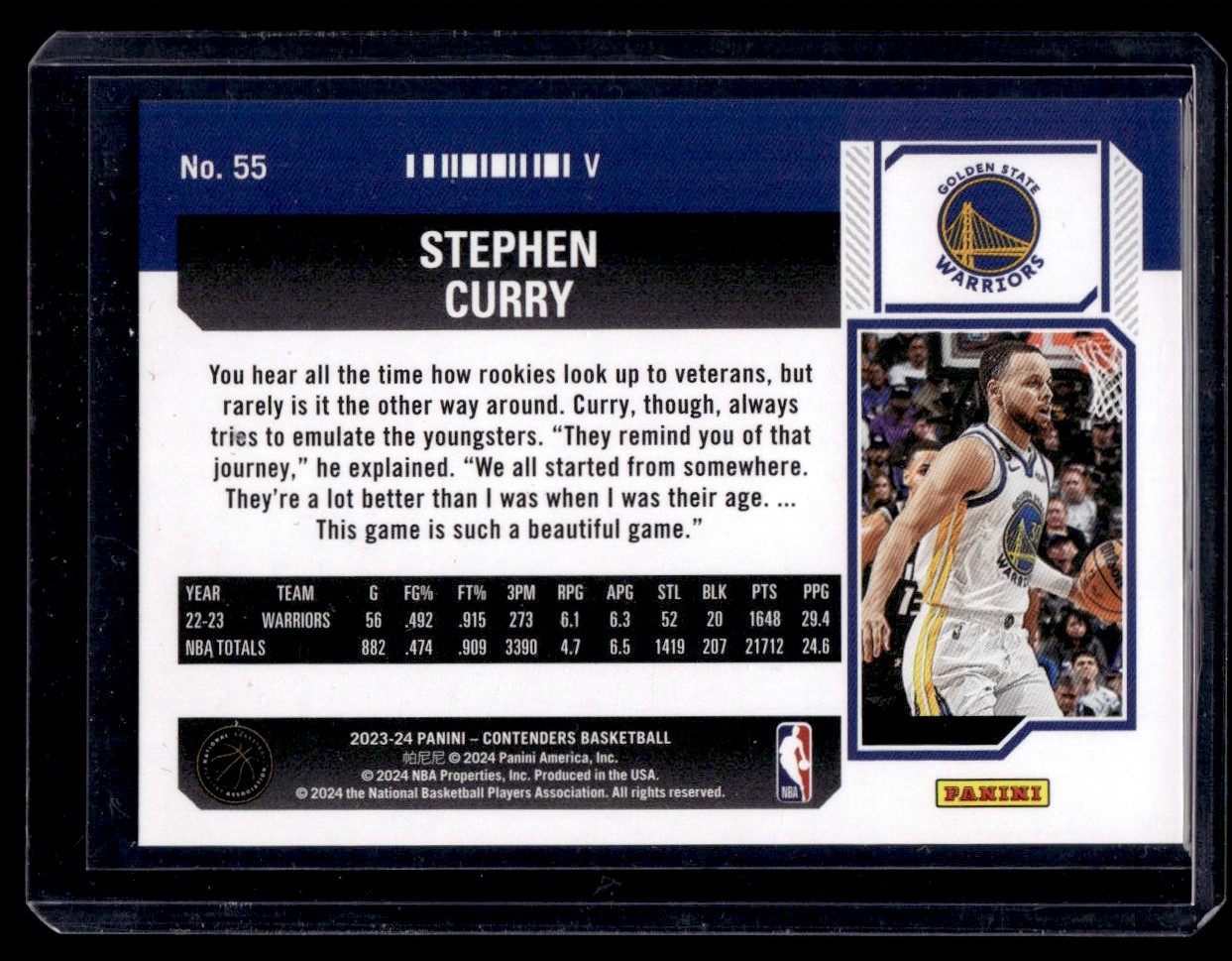 | Description: | Stephen Curry | | Category: | Basketball | | Year: | 2023 | | Product: | Panini Contenders Basketball | | Card Number: | 55 | | Special: | Ticket Photo Variation | | Dimensions: | 4" x 3" | | SKU: | BK a0126 R71 C (55) |