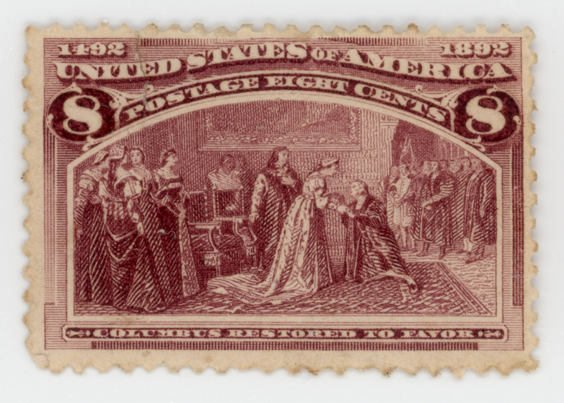 Immerse yourself in the splendor of American history with the United States stamp, Scott #236. This captivating 8-cent stamp, issued in 1893 as part of the illustrious Columbian Exposition series, features a beautiful depiction of the 'Troops Guarding Train' scene, commemorating the role of the military in the settlement of the American West. Bathed in a deep shade of violet brown, the intricate design, detailed engraving, and rich coloration make this stamp a true masterpiece of the 19th-century craftsmanship. As one of the mid-value denominations in the first-ever commemorative series issued by the United States, the Scott #236 holds a special place in the hearts of collectors and history enthusiasts worldwide.