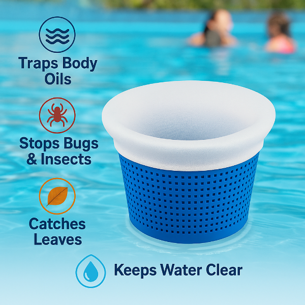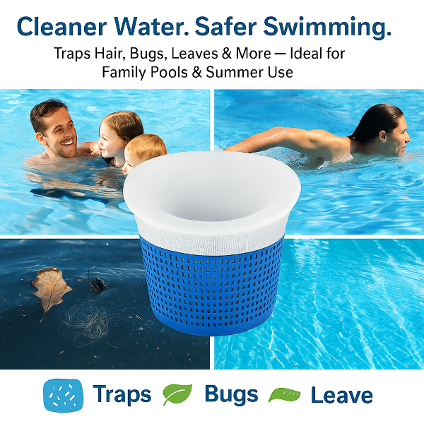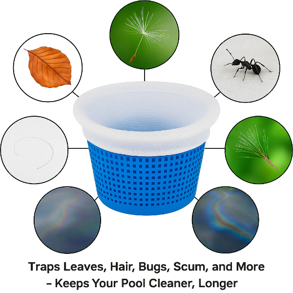 10 Pack Pool Skimmer Socks, designed for both above-ground and inground pools. Crafted from durable, ultra-fine nylon mesh, these skimmer socks trap leaves, grass, hair, pollen, pine needles, bugs, and oil before they reach your filter system. This protects your pool pump and extends its lifespan, reducing maintenance costs and time. Compatible with top brands like Hayward, Pentair, Intex, and Swimquip, these socks offer a universal fit for most skimmer baskets.