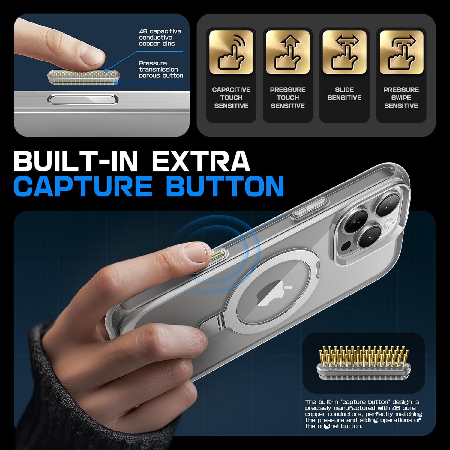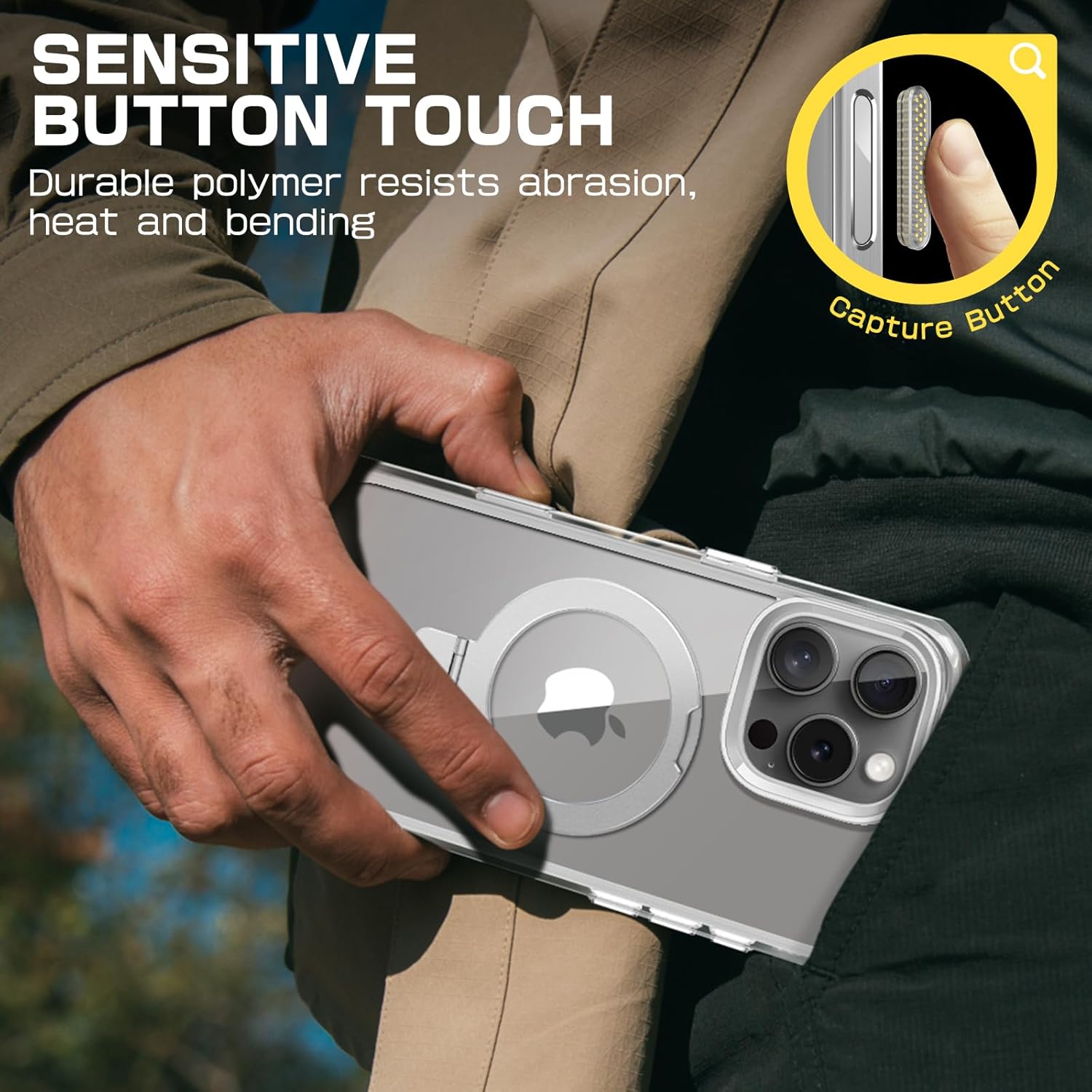 Sensitive Button Touch. Durable polymer resists abrasion, heat and bending. Quick access design with camera control capture button, seamlessly integrated with iPhone's button functions.