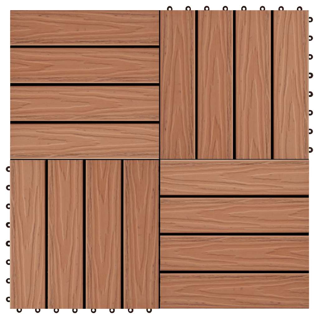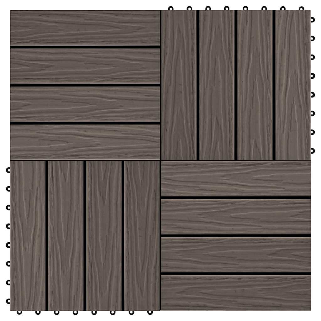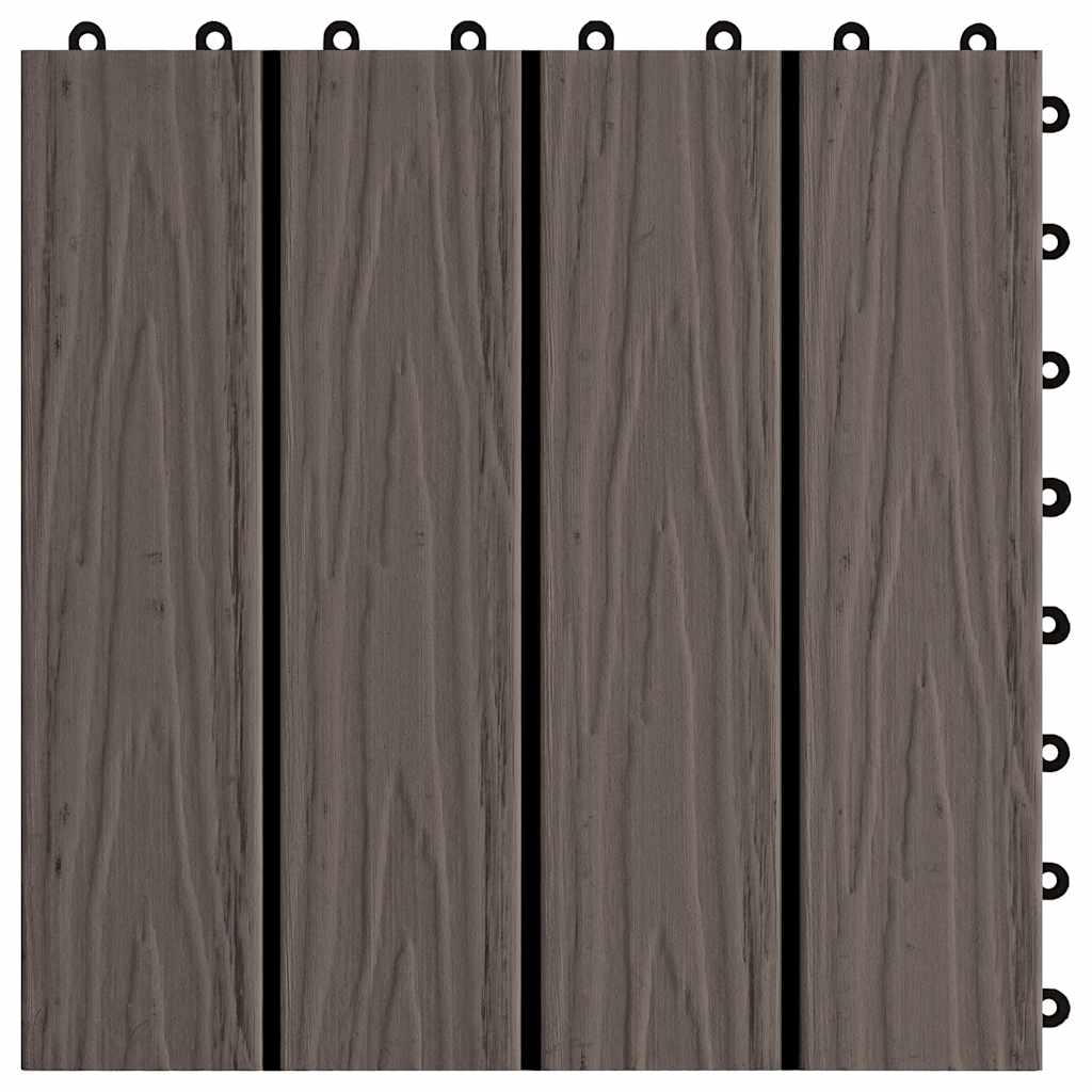 The deep-embossed WPC decking tile set, with an individual tile size of 11.8" x 11.8", consists of 11 pieces and covers a total surface area of 1 square meter. It will give a clean look to your patio, balcony, bathroom, or your pool or spa area.