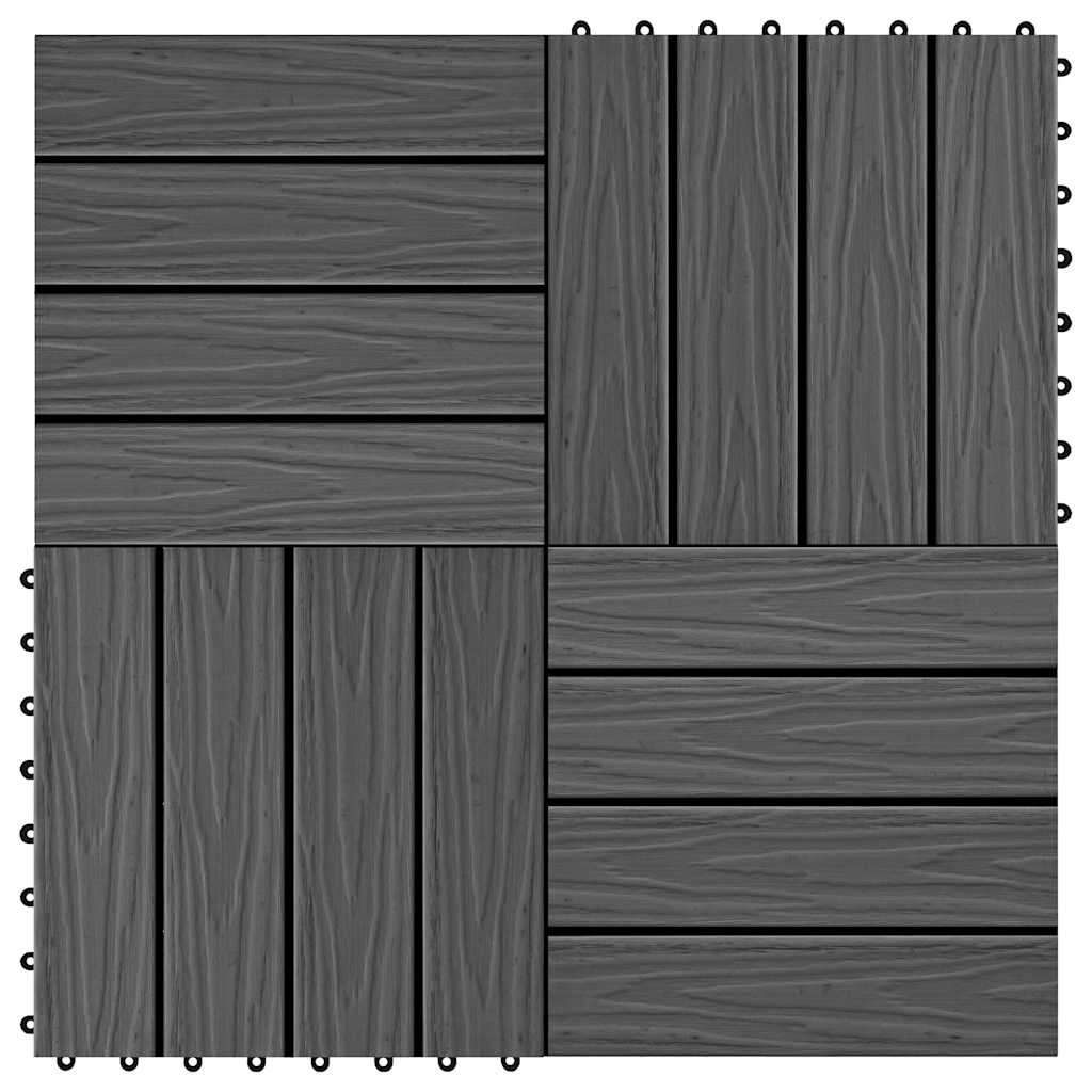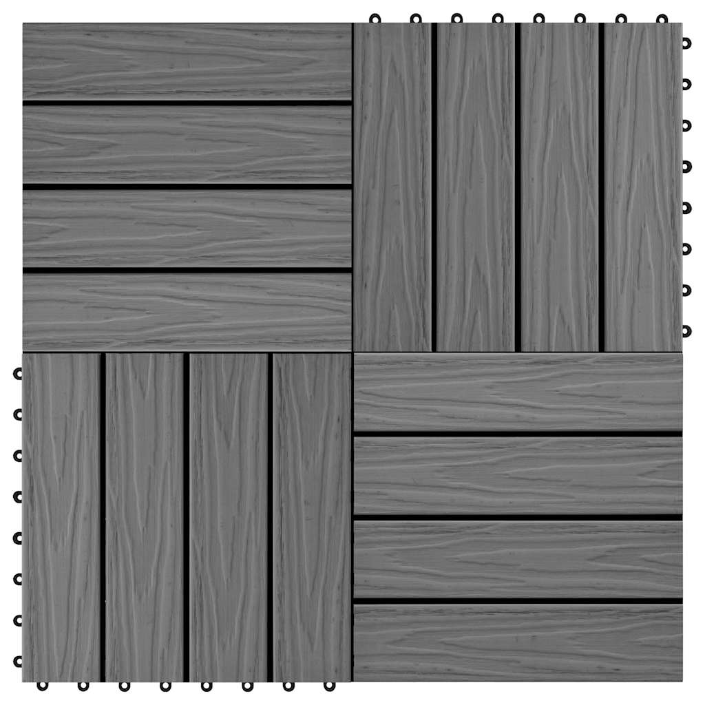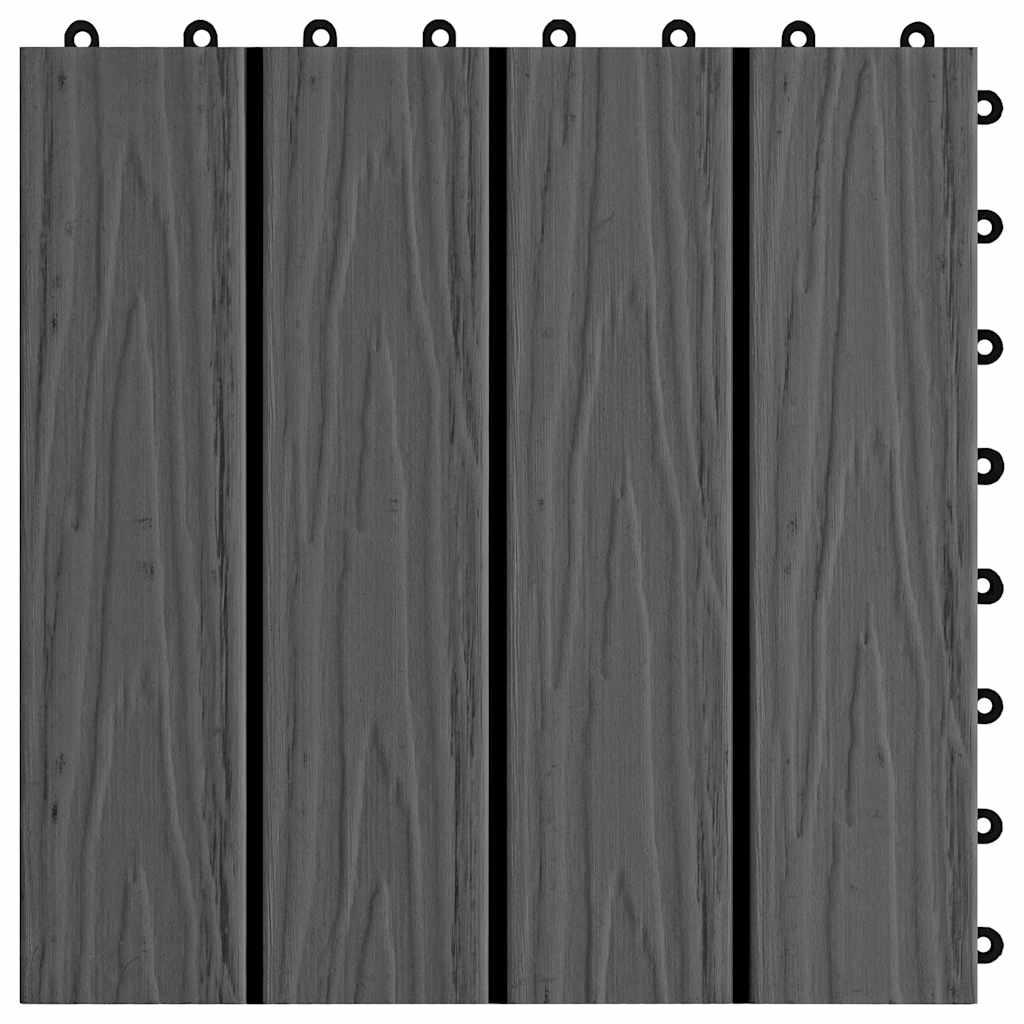 The deep-embossed WPC decking tile set, with an individual tile size of 11.8" x 11.8", consists of 11 pieces and covers a total surface area of 1 square meter. It will give a clean look to your patio, balcony, bathroom, or your pool or spa area.
