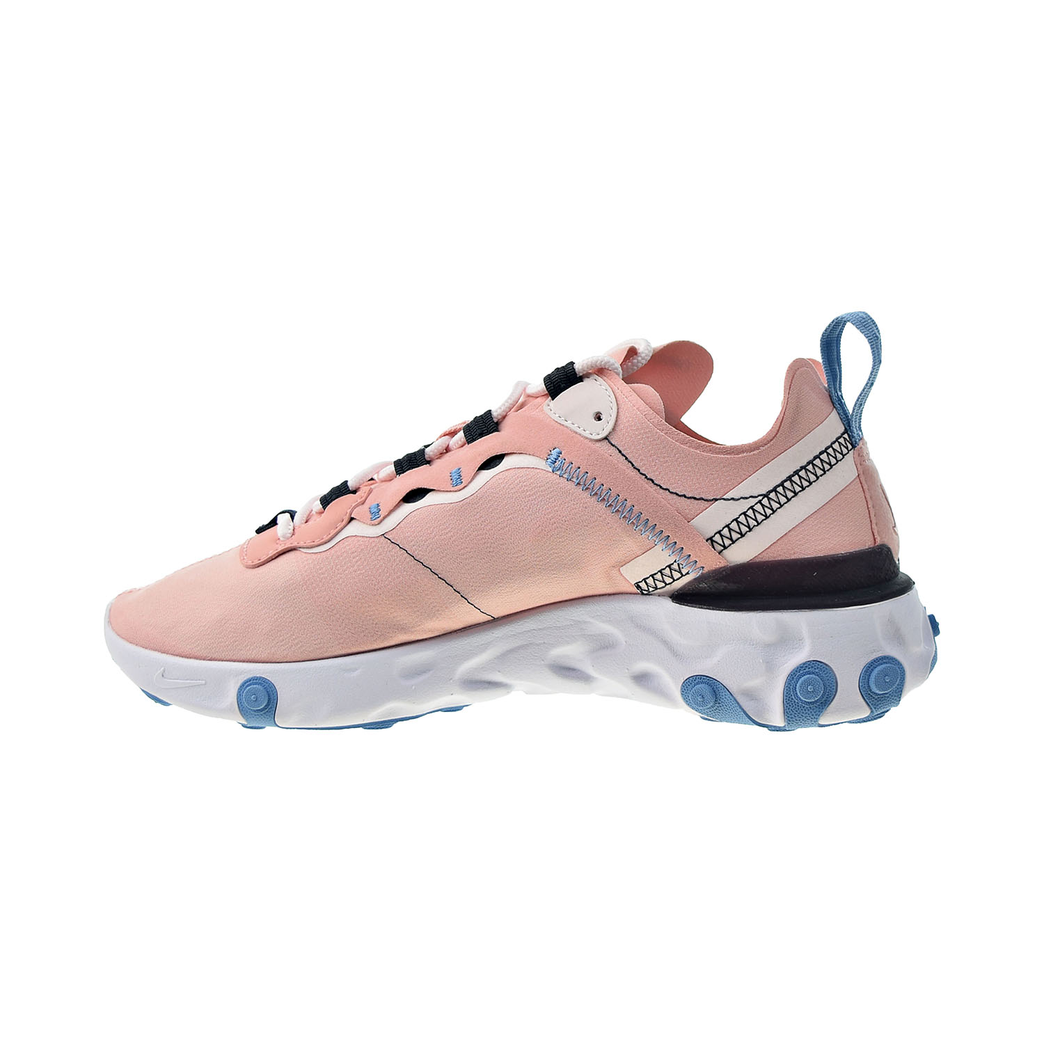 The Nike React Element 55 Women's shoe takes Nike React technology and soups it up with slick design lines. Taking inspiration from the Nike Internationalist, the React Element 55 dons a lightweight textile upper in coral pink. Dark grey accents arrive on the eyelets, Swoosh, and TPU heel clip, while exposed stitching creates interest on the heel strips. Light blue rubber pods are strategically placed on the running shoe's stark white sole to provide durable traction.