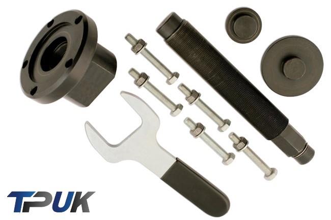 This kit has been developed to remove the front wheel bearing housing from the front drive flange. The front bearings are integral of their outer housing and due to their design are rendered un-serviceable when separated from the drive flange. Specifically for Ford Transit front wheel bearings from 2000.