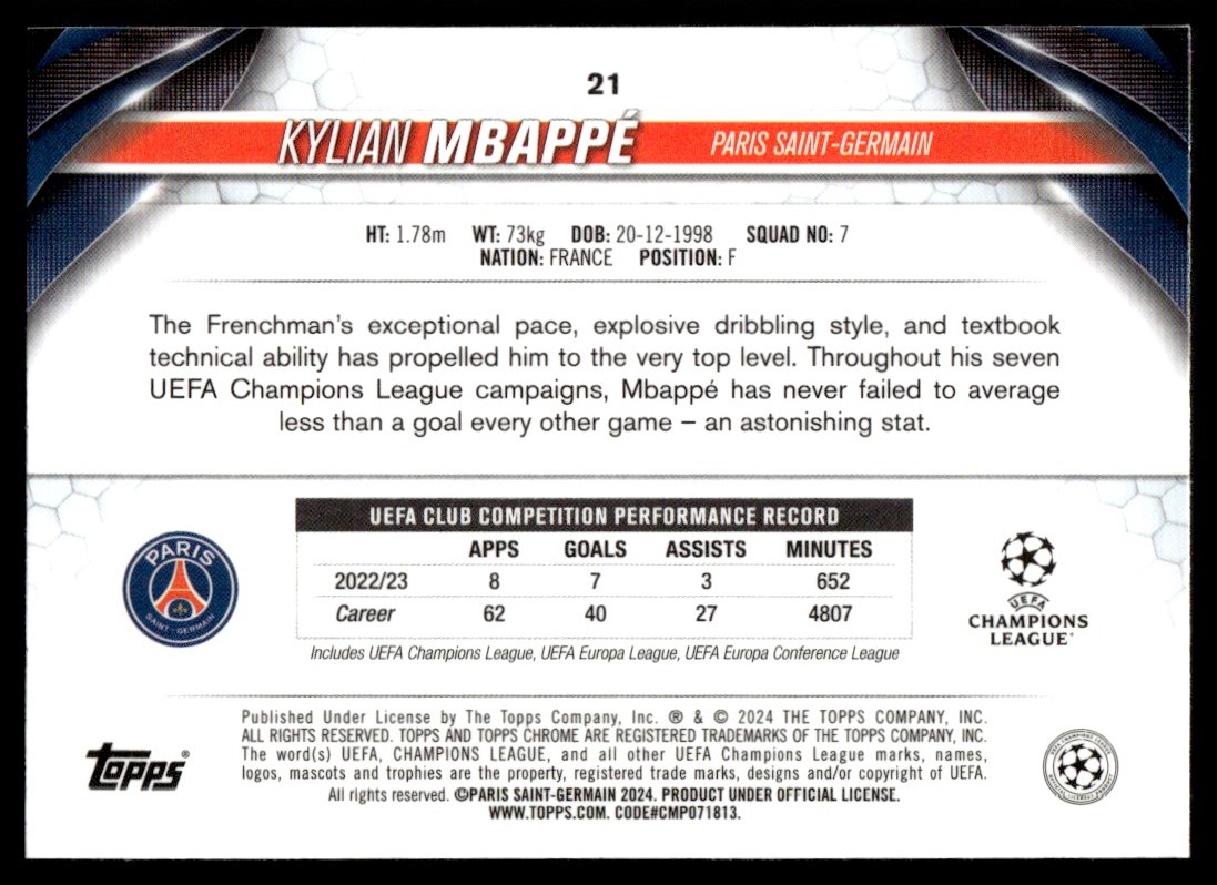 | Kylian Mbappé 2023 Topps UEFA Club Competitions Purple Foilboard #21 Card |