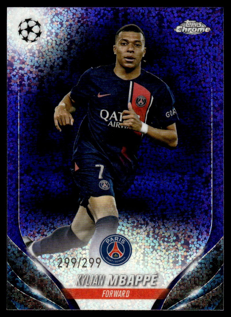 | Description: | Kylian Mbappé | | Category: | Soccer | | Year: | 2023 | | Product: | Topps UEFA Club Competitions Purple Foilboard | | Set: | Card | | Team: | Paris Saint-Germain | | Card Number: | 21 | | Serial Number: | 299/299 | | Dimensions: | 3½" x 2½" | | SKU: | SC A0157 R83 C (7) |