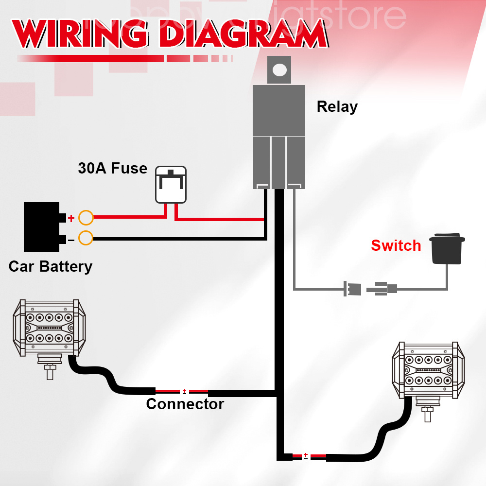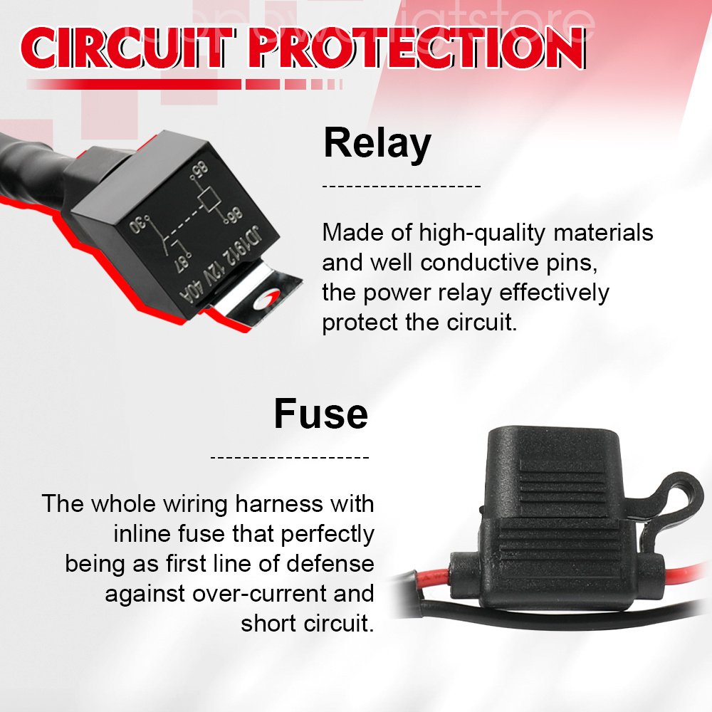 √ Great Construction:40A Power Relay and Inline Blade Fuse for multiple safety protection.With 2 lights output connections,it can hook with 2 led work light or 2 led light bar and any else off road LEDs.