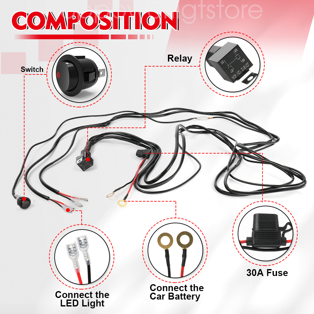 LED Light Bar Wiring Harness Kit with Fuse 40A Relay On-off Red LED Waterproof Switch