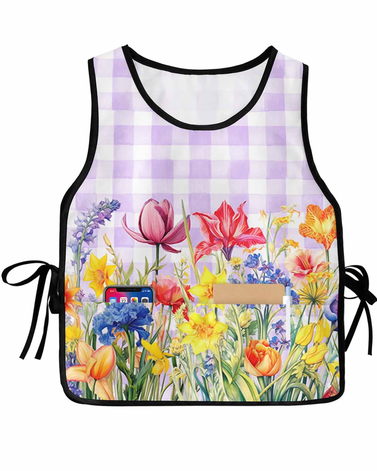 Buffalo Plaid Floral Cobbler Aprons with 2 Pockets for Women Men, Fashionable Printed Unisex Bib Waterproof Cleaning Smock Vest for Chef Kitchen Colorful Flowers Blossom Leaves 1 Pack, 20''x 27.5''