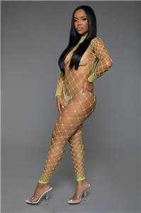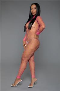 - Description: Large fishnet bodystocking features a high neck, long sleeves, cutout back and open feet. Thong and pasties not included.