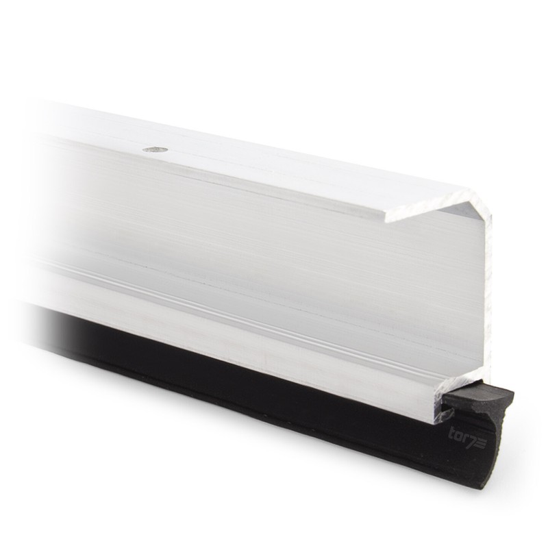 Bei Türen ohne Türabschluss ergibt sich ein Spalt zwischen Türblatt und Fußboden von ca. 10 mm, der keine Wärmedämmung oder Schutz gegen Zugluft bietet und daher abgedichtet werden sollte. Für diesen Einsatzzweck kann das Hörmann Alu-Abschlussprofil Auflaufschwelle verwendet werden. Diese ist auch für Flucht- oder Rettungswege zugelassen, bietet jedoch durch die 5 mm hohe Bodenschwelle keinen komplett barrierefreien Durchgang. Das Profil mit der Lippendichtung wird in der Vorrichtung im Türblatt mit Blindnieten befestigt und dichtet den unteren Türbereich in Kombination mit der Bodenschwelle ab.