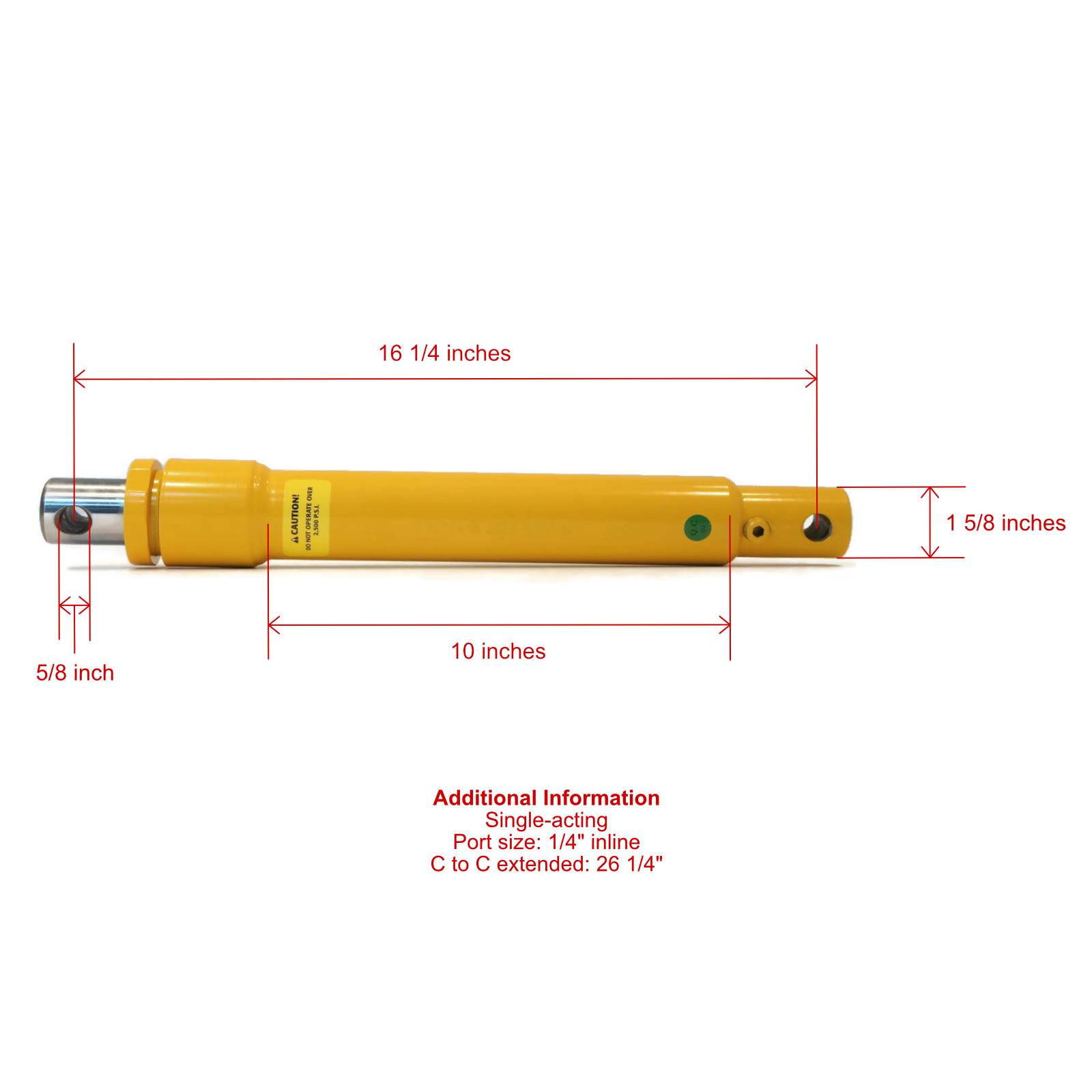 • Specs - Cylinder Stroke: 10". Cylinder Port Size: 1/4" Inline. Cylinder Pin Size: 5/8". Retracted Cylinder Length: 16 1/4". Extended Cylinder Length: 26 1/4". Cylinder Rod Thickness: 1 1/2". Cylinder Base Thickness: 1 5/8". Cylinder Bore Size: 1 1/2". Cylinder Action Type: Single. Hose Length: 45". House Thread Size: 1/4". Maximum Hose Pressure: 2750 PSI. Refer to images 2 & 3 for more information