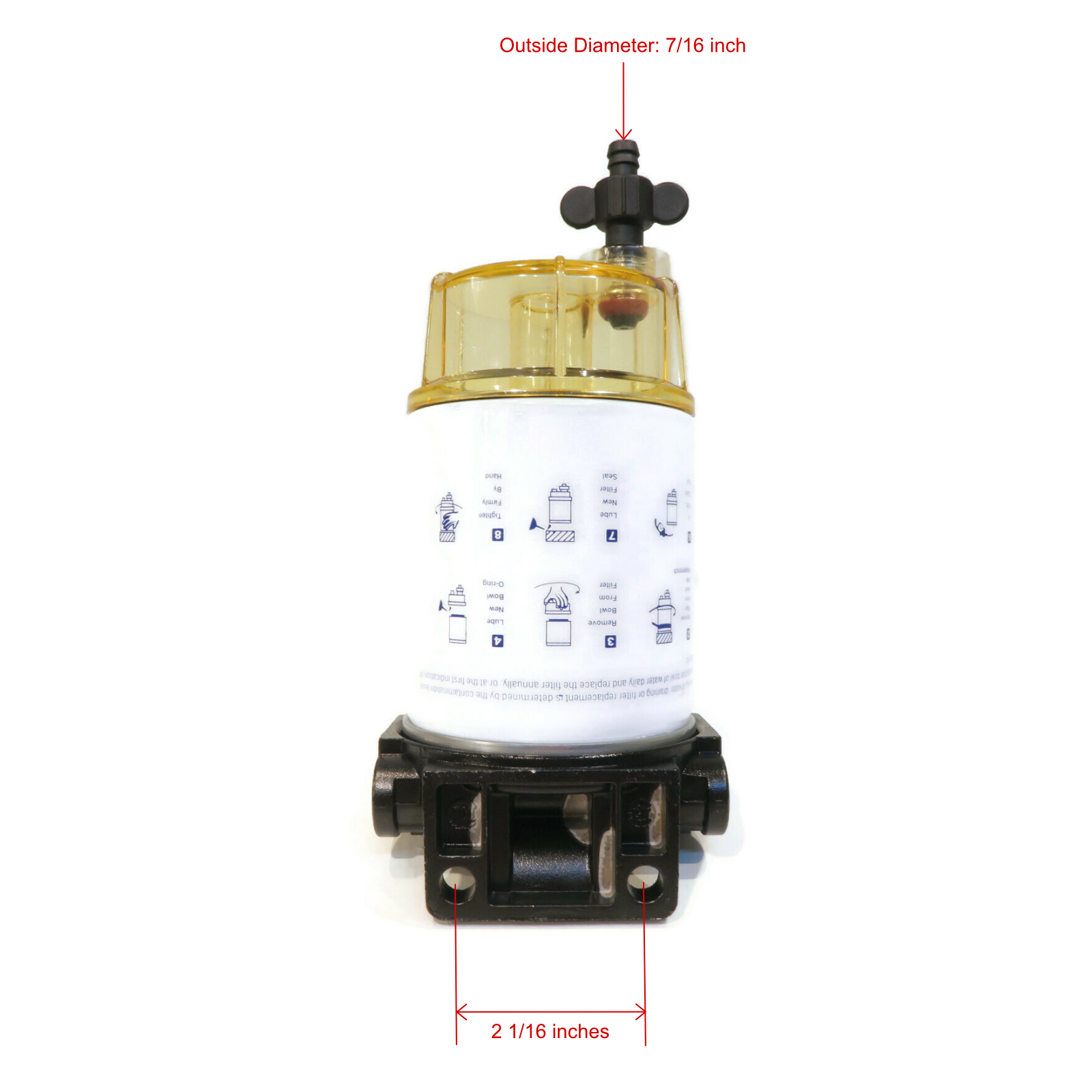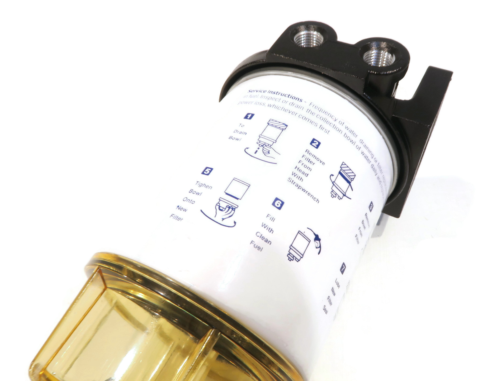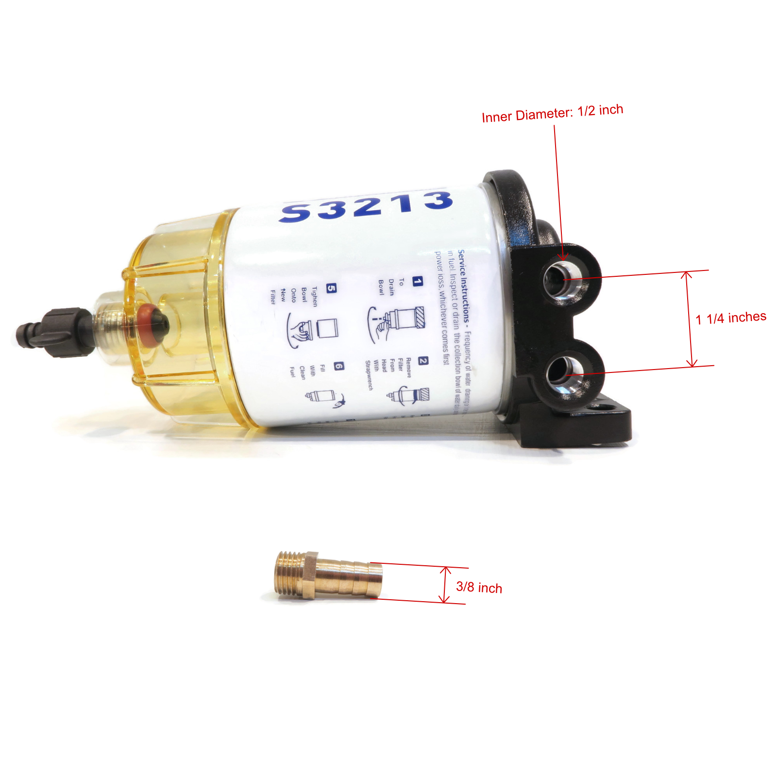 • Includes - (1) Water Separating Fuel Filter with Bracket & Reusable Bowl, (2) Connector Barbs, (2) Pipe Plugs; comes as shown in the first image