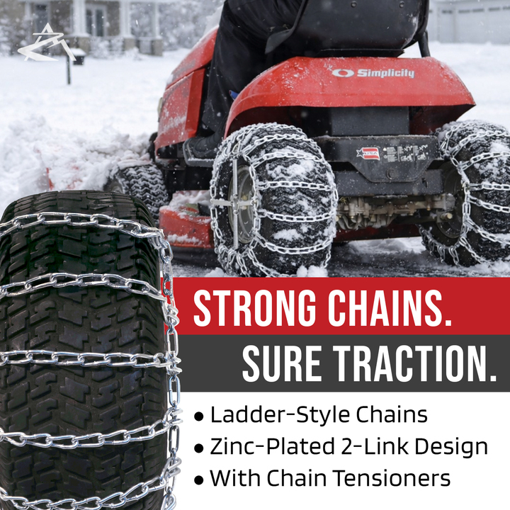 • Includes - (1) Pair of Zinc-Plated, 2-Link Tire Chains, (1) Pair of Chain Tensioners; comes as shown in the first image. Tires NOT Included. Please Note: Tire chains in picture are a representation. They are not the exact tire chains you will receive