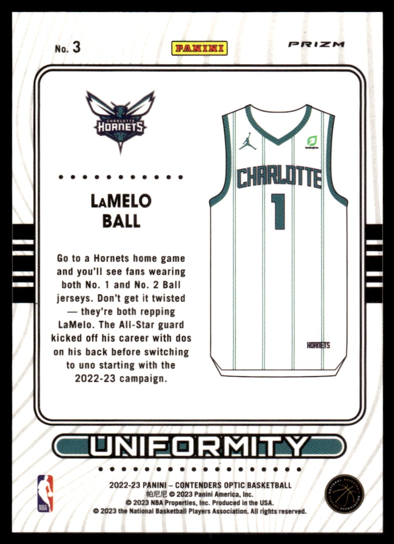 | LaMelo Ball Silver Prizm 2022-23 Panini Contenders Optic Uniformity #3 Charlotte |