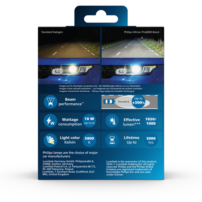 * Die Philips Ultinon Pro6000 LED Boost-Serie ist nur für den Straßenverkehr und für die aufgeführten Fahrzeugmodelle und Beleuchtungsfunktionen in Ländern zugelassen, in denen eine Genehmigung besteht. Weitere Informationen über die in Ihrem Land geltenden gesetzlichen Bestimmungen und die aktuelle Kompatibilitätsliste finden Sie auf der Herstellerseite Philips . Sie sind dafür verantwortlich, die in Ihrem Land geltenden gesetzlichen Anforderungen einzuhalten.