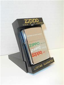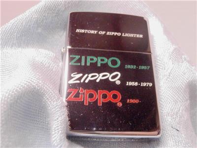 FOR YOUR CONSIDERATION WE HAVE A ZIPPO LIGHTER DATED TO 1991. THIS LIGHTER IS FROM THE HISTORY OF ZIPPO SERIES, AND COMES WITH THE ORIGINAL BOX. THIS LIGHTER FEATURES THE CHANGES IN THE ZIPPO SIGNATURE MARK SINCE ITS ORIGIN IN 1932. THIS LIGHTER FEATURES A HIGHÂ CHROME FINISH WITH WRITING IN RED, WHITE AND GREEN ENAMEL. IT DOES NOT HAVE AN ORANGE SAFETY LABEL, BUT IS UNFIRED.