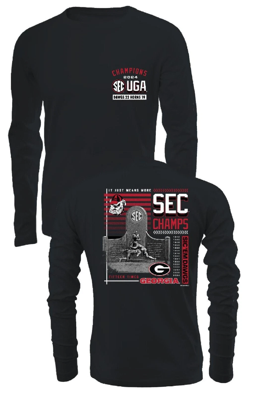 University of Georgia Bulldogs fans can show off their amazing over time victory in the SEC Championship game against Texas with this Georgia Bulldogs Adult 2024 SEC Champions Long Sleeve T Shirt from New World Graphics which comes in Black to show your team pride. Constructed from 100% Machine Washable Cotton with a standard fit body this long sleeve tee features a crewneck collar and a front left chest graphic which shows the Trophy along with the final score and a screened Trophy logo with the dates of the Dawgs 15 SEC championships and a Sic Em Dawgs Graphic on the back.