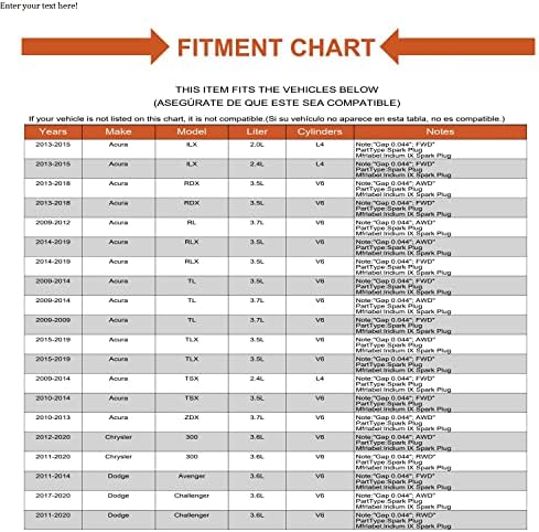 | Acura | ZDX | 2010-2013 | Iridium IX Spark Plug | 3664 | 6 | 3.7 | Gap 0.044" | ||||||