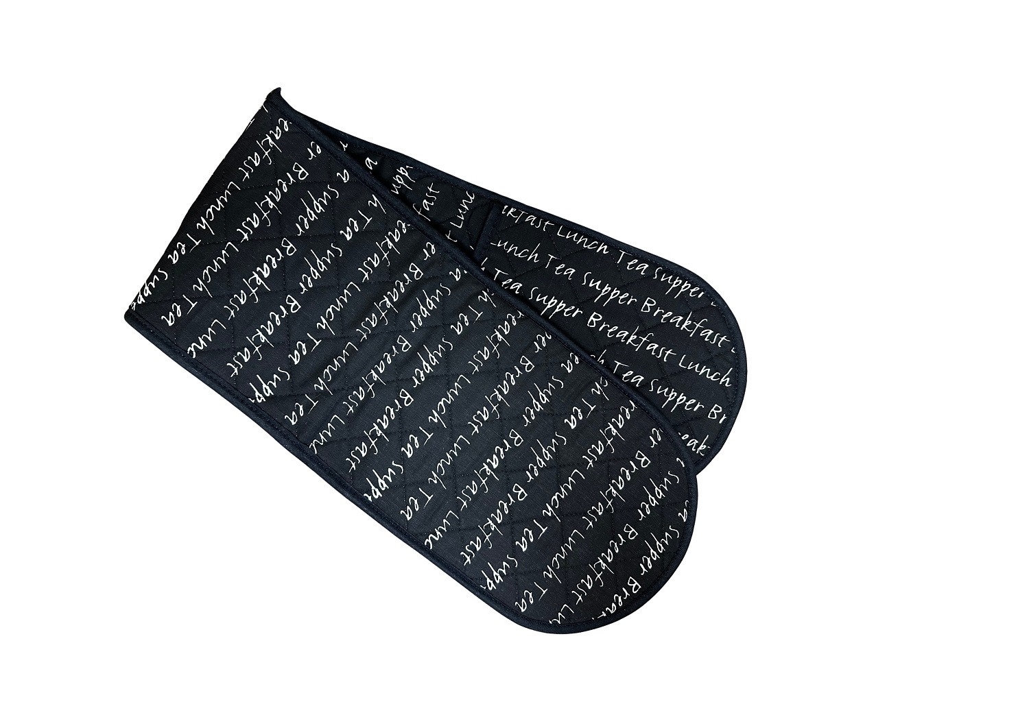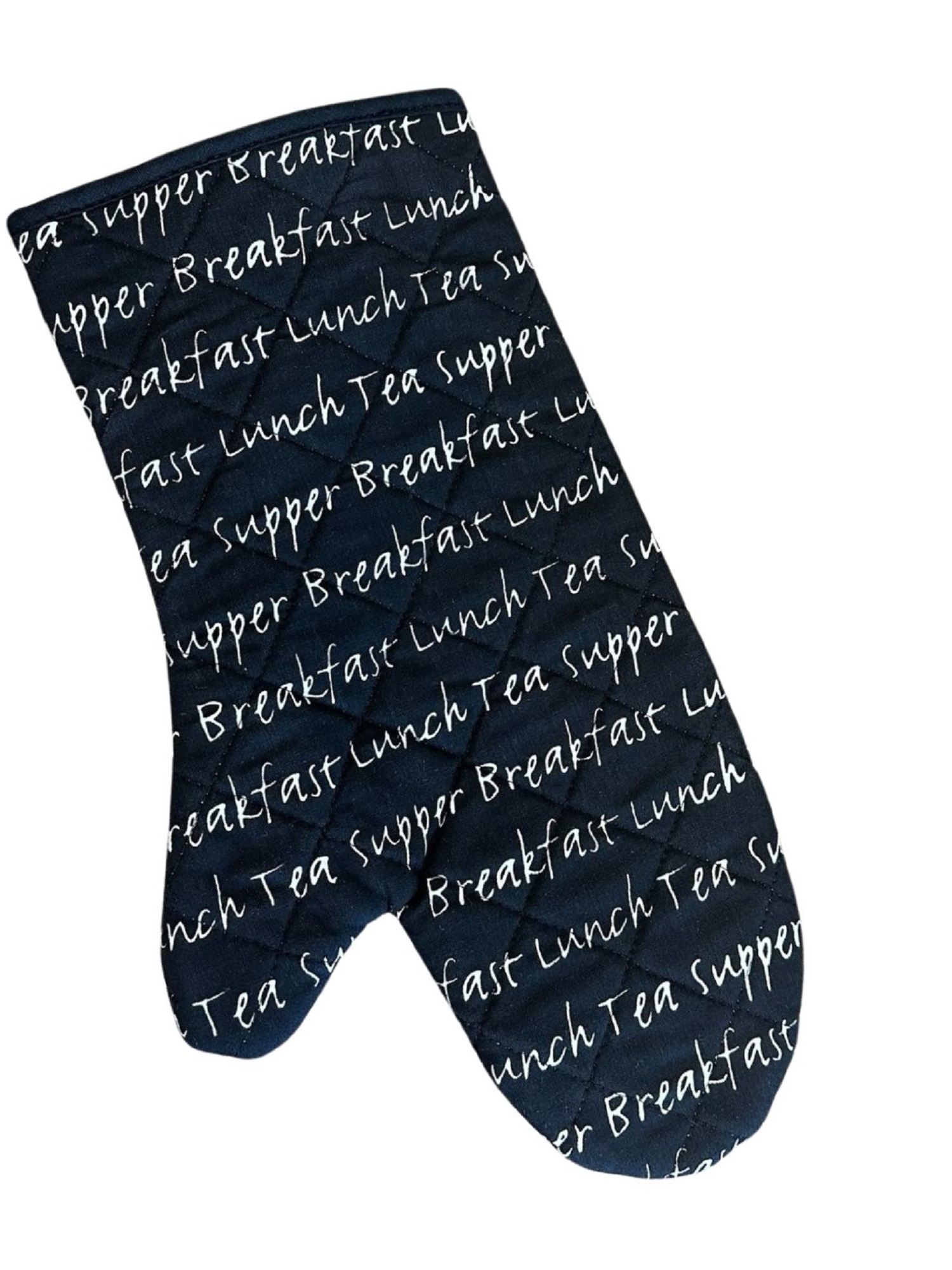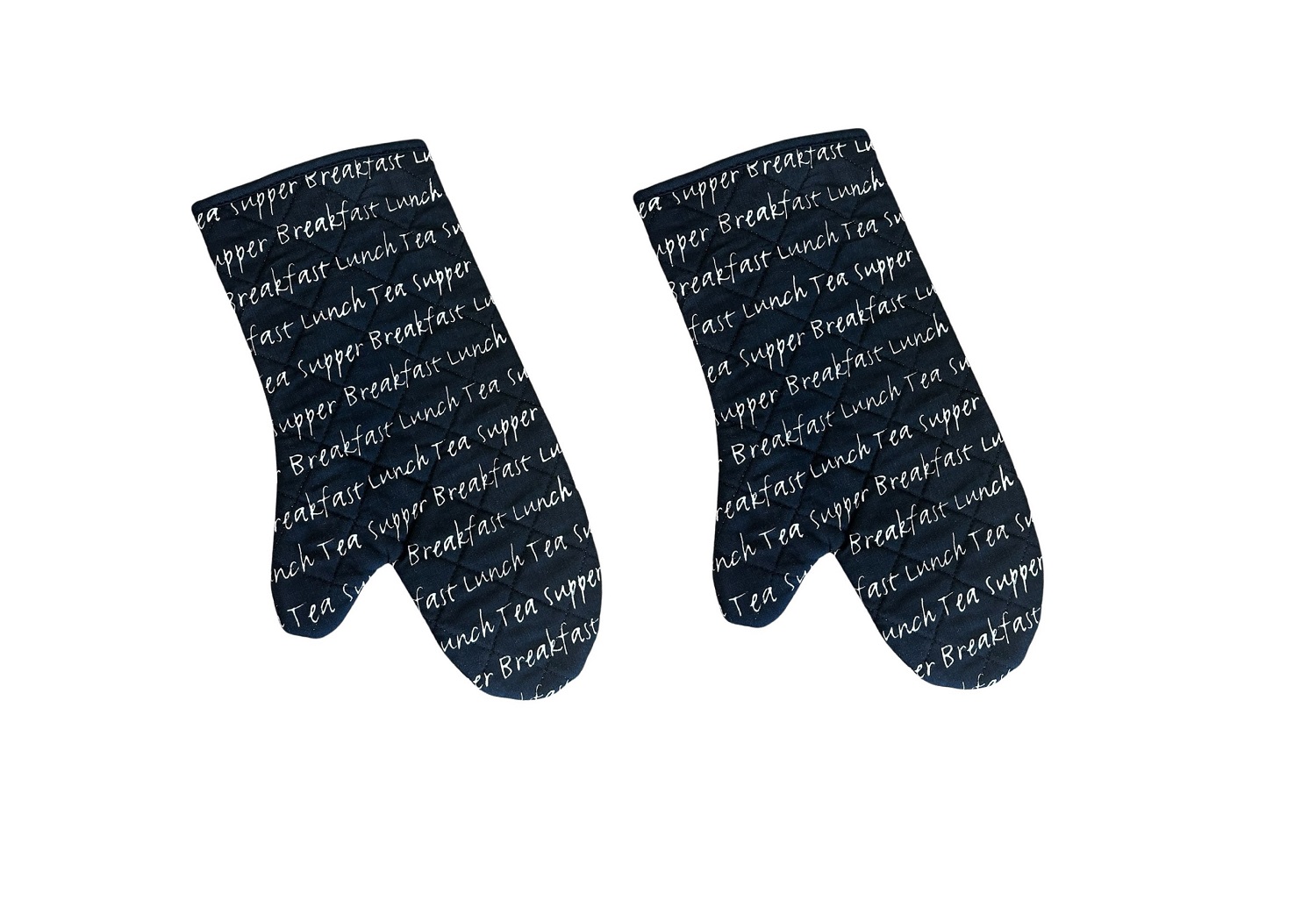These gauntlets and double oven gloves are quilted with mealtime script text throughout, reading Breakfast, Lunch, Tea, and Supper. Perfect for any meal prep!