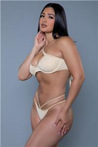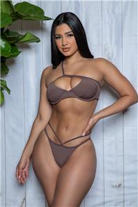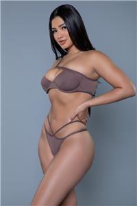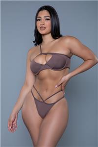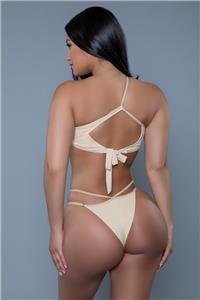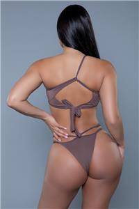 - Description: Two-piece bikini set includes a one shoulder strap top with large keyhole cutout front and back, tie back closure, adjustable strap, padded cups and a matching Brazilian cut cheeky bottom.