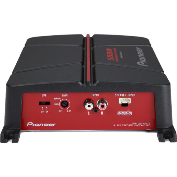 The GM-A3702 offers support for 2 Ohm and 4 Ohm speakers, and can produce up to 500 W of power when bridged.