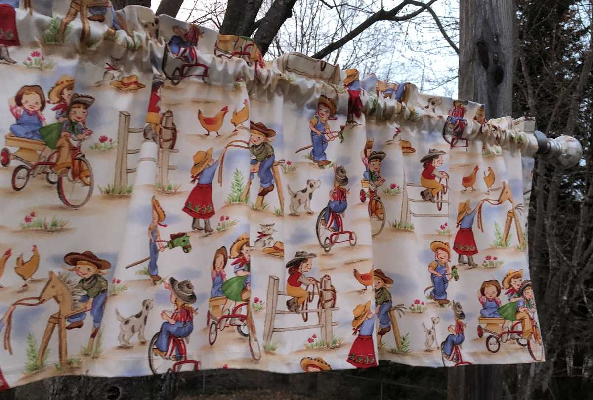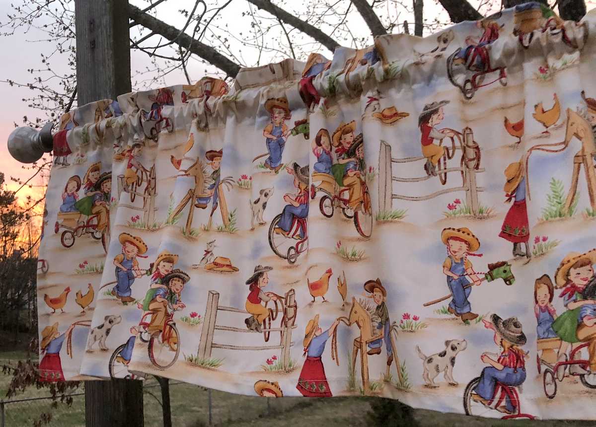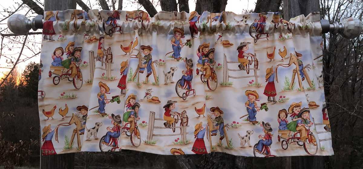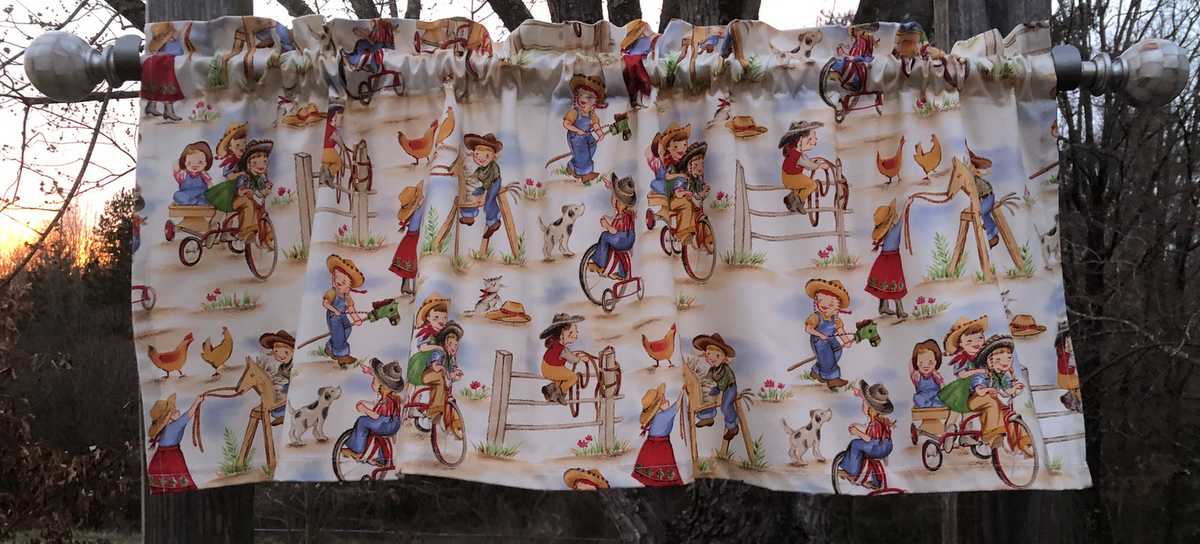 Cowboy Cowgirl Ranch Camp Tricycle Horse Dog Chickens Girl Curtain Valance NEW
