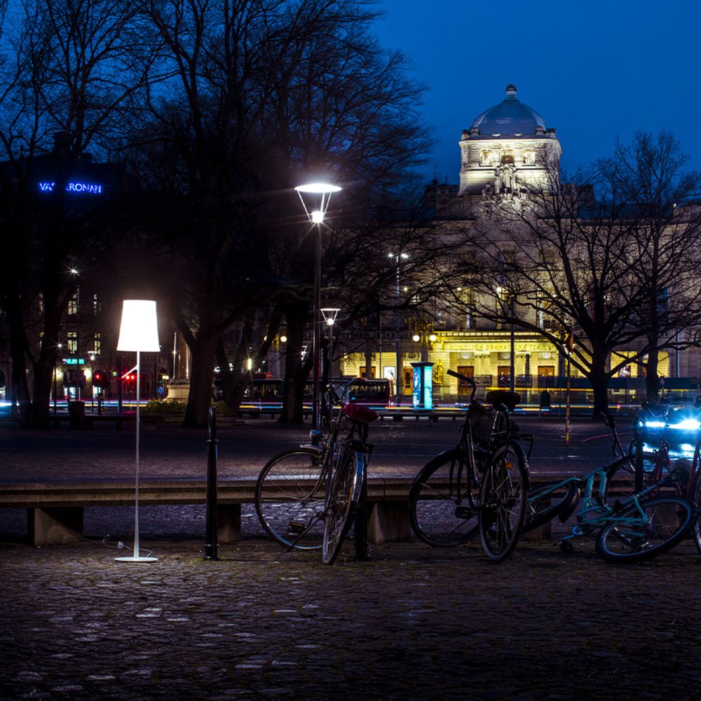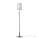 Lampada da terra e da lettura a luce diffusa. Base in lega di zinco pressofusa e stelo in acciaio entrambi verniciati a liquido. Diffusore interno opalino in policarbonato e diffusore esterno in policarbonato traslucido entrambi stampati a iniezione. L’interruttore on/off è posizionato sul cavo trasparente.
