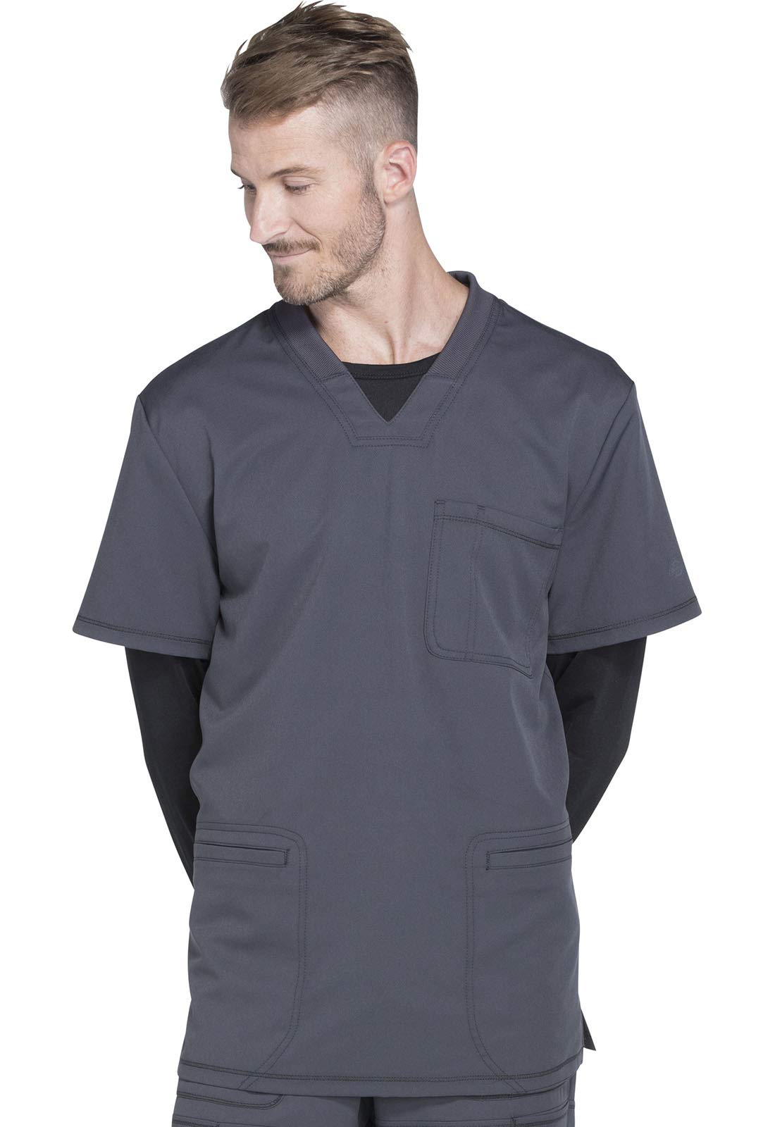 Dickies Medical Nursing Scrubs | Advanced Fabric and Features Medical scrubs for men enter a new era of style and sport performance with Dickies Dynamix. This short sleeve V-Neck top mixes elevated functionality with our favorite athletic features. Light polyester/spandex fabric blend and textured dobby construction was inspired by sports apparel. Chest pocket with instrument stitch for extra storage. Two roomy lower welt pockets to store your workday essentials. Right lower pocket features a cool tech upgrade: Grommet inside pocket creates a cable management system for your headphones. Route the headphone cables through the grommet and under your top to keep you wired in during break time. Back yoke for fit and shaping. Side vents. Coverstitch detail throughout garment provides extra athletic appeal. Discrete tonal logo heat transfer on left sleeve. Heat transfer neck label for comfort. Tired of the same old nurse uniform? Try our Dickies Dynamix cool shirts for men. This V-Neck scrub top is just what you're looking for. Perfect for doctors, physician assistants, nurses, radiology techs and physical therapists. For scrubs men will wear again and again, shop the entire Dickies Dynamix collection. Dickies Dynamix: Inspired by sport, designed for the way you work. Men's fit. Moisture wicking finish moves moisture away from the body to keep you comfortable through a long work shift. Wrinkle resistant. Body: 91% polyester / 9% spandex textured dobby Rib-knit trim: 96% polyester / 4% spandex Center back length (size M): 30"