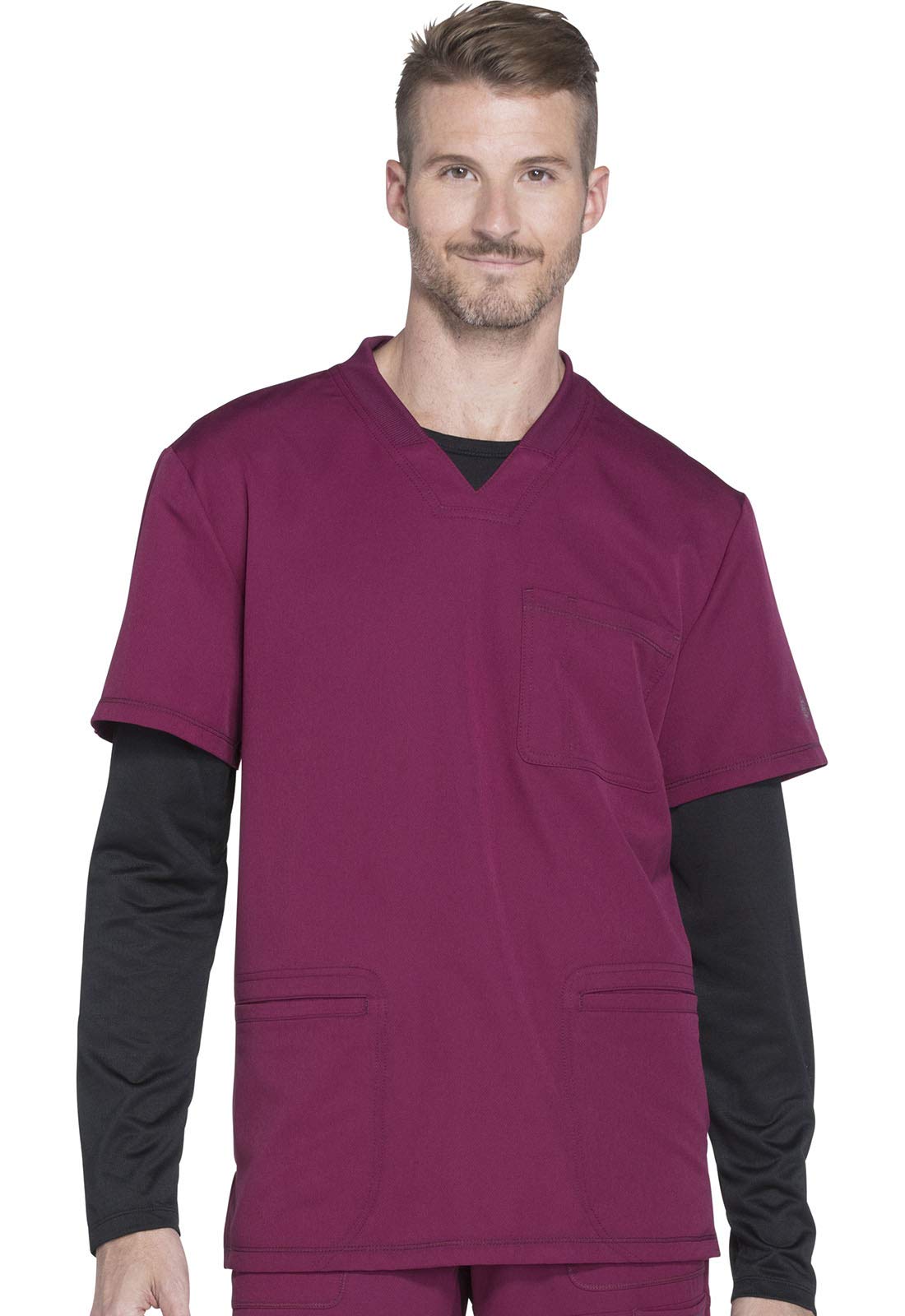 Dickies Medical Nursing Scrubs | Advanced Fabric and Features Medical scrubs for men enter a new era of style and sport performance with Dickies Dynamix. This short sleeve V-Neck top mixes elevated functionality with our favorite athletic features. Light polyester/spandex fabric blend and textured dobby construction was inspired by sports apparel. Chest pocket with instrument stitch for extra storage. Two roomy lower welt pockets to store your workday essentials. Right lower pocket features a cool tech upgrade: Grommet inside pocket creates a cable management system for your headphones. Route the headphone cables through the grommet and under your top to keep you wired in during break time. Back yoke for fit and shaping. Side vents. Coverstitch detail throughout garment provides extra athletic appeal. Discrete tonal logo heat transfer on left sleeve. Heat transfer neck label for comfort. Tired of the same old nurse uniform? Try our Dickies Dynamix cool shirts for men. This V-Neck scrub top is just what you're looking for. Perfect for doctors, physician assistants, nurses, radiology techs and physical therapists. For scrubs men will wear again and again, shop the entire Dickies Dynamix collection. Dickies Dynamix: Inspired by sport, designed for the way you work. Men's fit. Moisture wicking finish moves moisture away from the body to keep you comfortable through a long work shift. Wrinkle resistant. Body: 91% polyester / 9% spandex textured dobby Rib-knit trim: 96% polyester / 4% spandex Center back length (size M): 30"