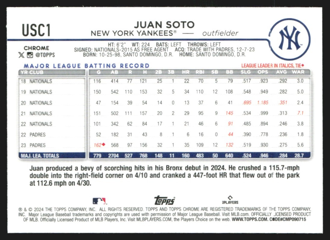 | 2024 Topps Chrome Update Juan Soto #USC1 GS1-5 |