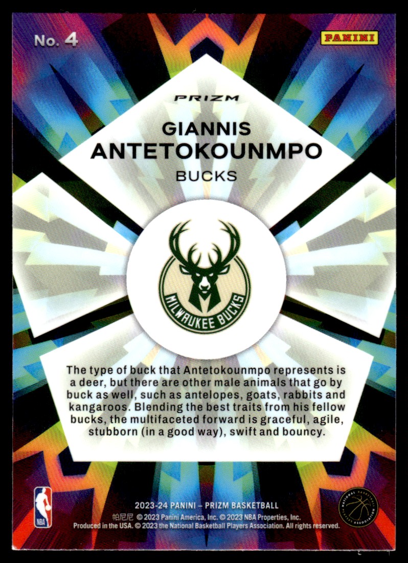 | Description: | Giannis Antetokounmpo | | Category: | Basketball | | Year: | 2023 | | Product: | Panini Prizm | | Set: | Card | | Team: | Milwaukee Bucks | | Card Number: | 4 | | Special: | Kaldeidscope Silver | | Dimensions: | 3½" x 2½" | | SKU: | BK a0187 R113 B (14) |