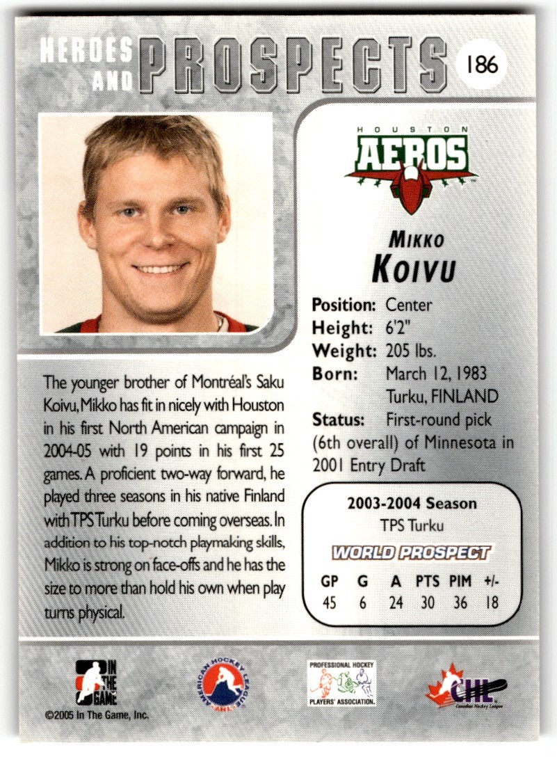 | 2004-05 In The Game Heroes and Prospects Mikko Koivu #186 Houston Aeros |
