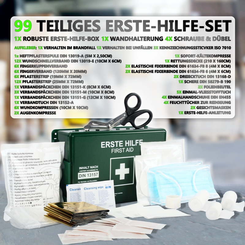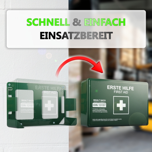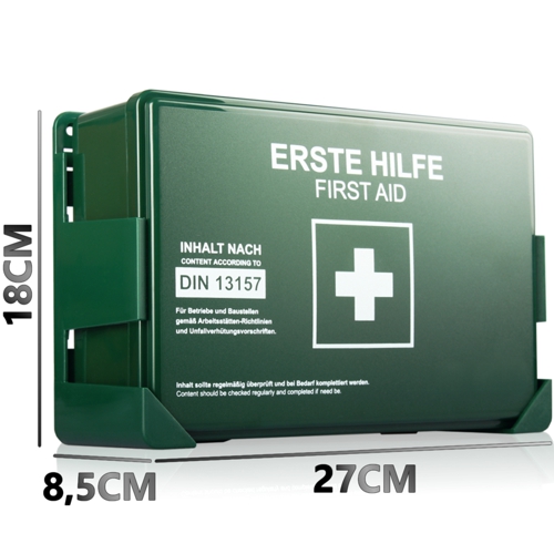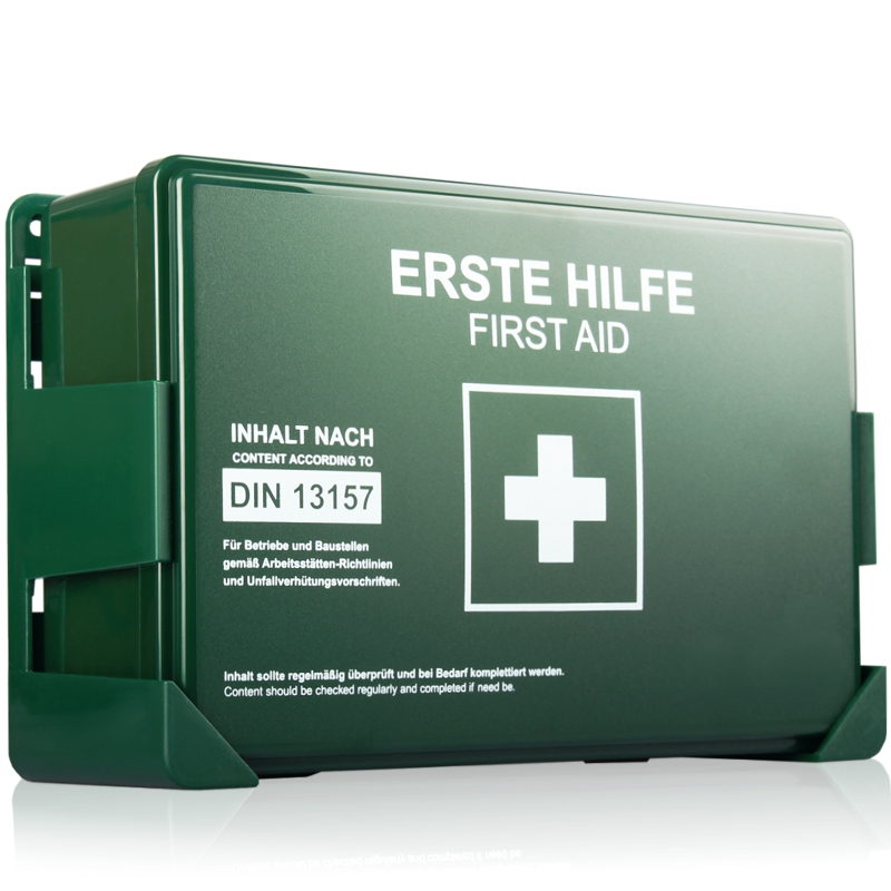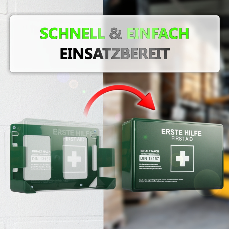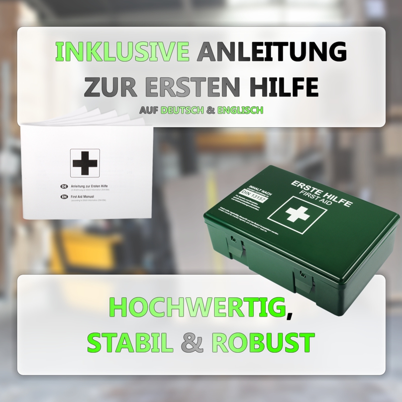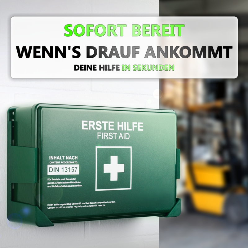 Mit diesem Erste-Hilfe-Verbandskasten des Premiumherstellers PETEX® treffen Sie eine zuverlässige Wahl im Bereich „Erste Hilfe“. Der Betriebsverbandskasten erfüllt die DIN 13157 und wird inklusive einer praktischen Wandhalterung für einen schnellen Zugriff geliefert. Der Kasten ist aus stabilem Kunststoff gefertigt und dank der innenliegenden Gummidichtung Spritzwasser geschützt. Somit ist der Inhalt (das Verbandmaterial gemäß DIN 13157:2021) sicher aufbewahrt. Im Lieferumfang sind zudem 5 Aufkleber (3 Kennzeichnungssticker nach ISO 7010 sowie „Verhalten im Brandfall“ + „Verhalten bei Unfällen“) enthalten. Dieser Betriebsverbandskasten ist die ideale Lösung für eine umfassende und schnelle Erste-Hilfe-Versorgung.