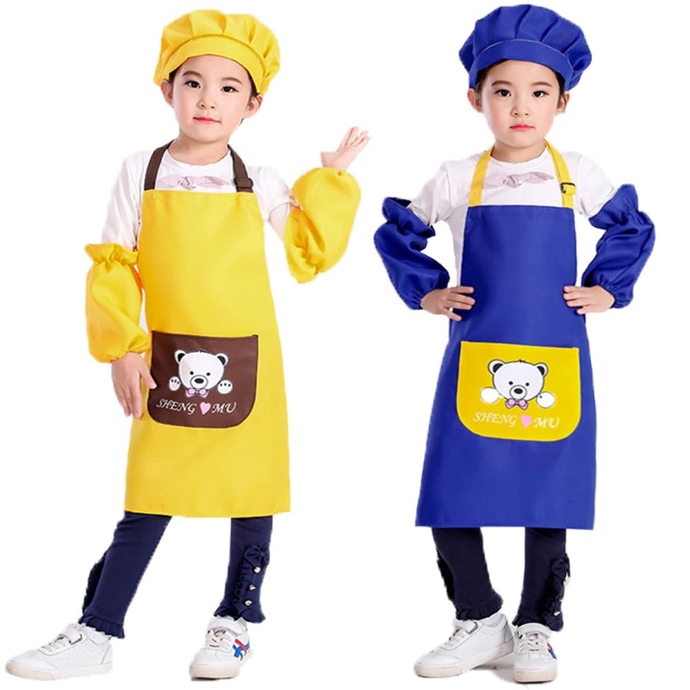 Waterproof Toddler Kids Apron with Pockets 2 Pack Cotton Child Art Craft Smock Apron Kitchen Chef Aprons for Cooking Baking Painting(Blue&Yellow)