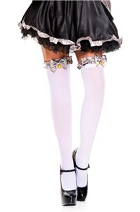 - Description: Opaque thigh high stockings feature a ruffled trimmed top and satin bow accents. Costume not included.