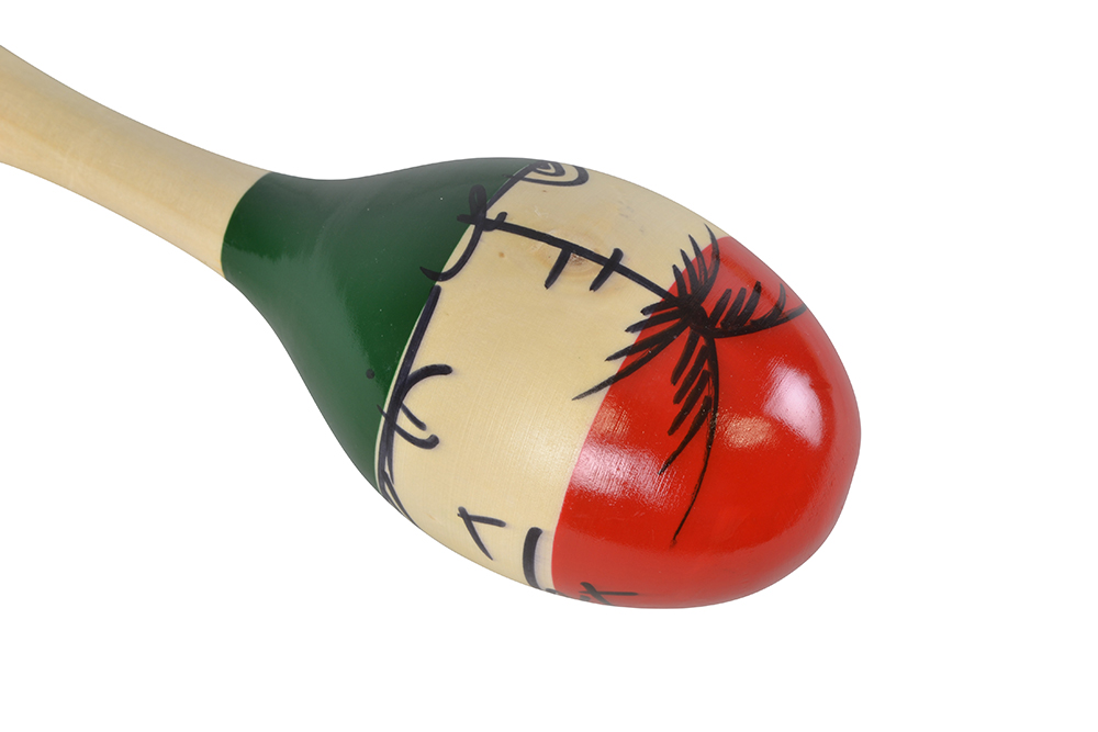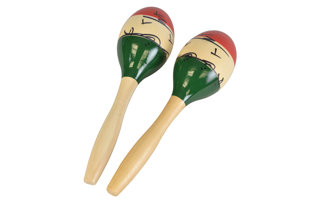 A pair of Mexican style maracas, requires modest skill to play in time to music. Players can shake the maracas or hit them against their hand or leg to get a variations in sound.